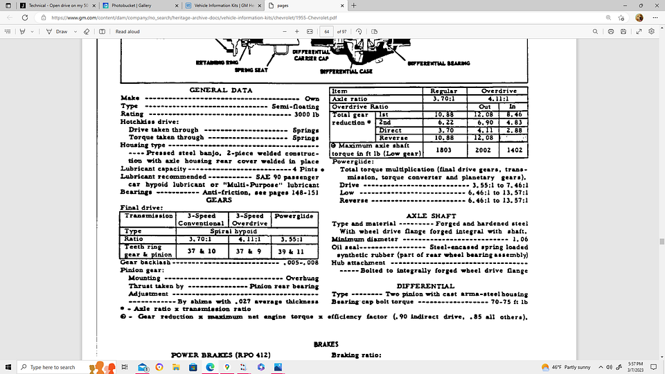 According to the GM Heritage site a 55 3 speed standard has 3.7 Gears an over drive has 4.11 and the powerglide has a 3.55. That was standard issue when they left the factory. From the GM heritage archives 55 chevy car pfd pages (gm.com)