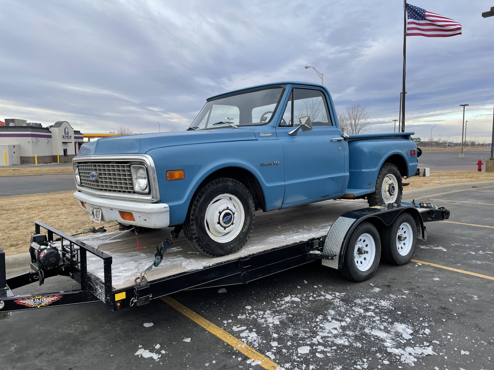 Here's my 71 C20 I rescued when I lived in Abilene KS. Was on craigslist for $400. Didn't run, no bumper or windshield. My brother in Connecticut called the guy, got him down to $300 and delivered to my place. 350 4bbl 4 speed. I got it running. The battery to starter cable was wrapped in electrical tape and underneath was all corroded. Swapped on a new cable and it fired right up. Put in a new windshield and gasket. Drove it for a few months until it dropped a rod cap on the way home from work one day. It sat for awhile until i pulled the motor and had it machined. Von Beemer, local dirt track and hot rod engine builder put the motor together. RV cam and some crazy milled heads he had on a shelf. Put on some old glass packs off an old wheat truck and it sounds really good. I bop around doing yardwork with it and use it to gather maple sap when I boil to make maple syrup. Side note: this truck was sold new at Sullivan Chevrolet in Salina Kansas, about 25 miles from my farmhouse. At the time I worked in the building that was part of the former dealership. I need some correct hubcaps.