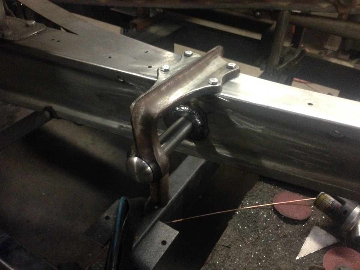 Hey guys, Sorry I've been MIA. I went to Chicago with the car, where we did very well. We went up against the Ridler winner for the Legend cup, and we brought home the trophy. Couldn't be happier! Anyway, here is an early test of the front suspension actuator. Rear end with drums installed. Here is the rear shock arms in progress. How the rear shocks mount in the frame rail. This is the beginnings of the front shock arms.