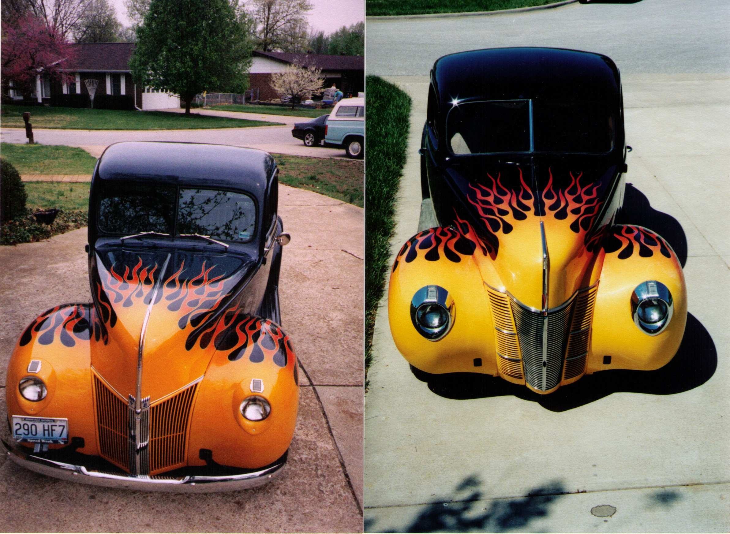 Thanks for the comment, Ed. I don't know if I ever told you the story behind the flames, so I will share it here. I'll preface this by saying flames are extremely subjective. Also, I can point out everything I did "wrong" in taping off the flames on my coupe. My coupe came to me via a generous uncle who had hauled it out of a garage in south St Louis for a widow who was paying garage rent for her husband's project. I was 5 years old at the time, so I had a LOT of time to dream about it. It also happened around the same time I first saw photos of Gene Sonnen's '40 coupe at Peoria, which seared into my brain that someday, my coupe would be black, flamed, and wear 5 spokes. I had been driving the coupe for a about 4 years with original Henry paint on the body, most of the hood, and rattle can primered fenders, with some moon discs on the wheels, when a kid left a note on my windshield telling me he wanted to do the body and paint on the coupe. Being a young father, and knowing what bicycle pedals do to fenders of hot rods from personal experience around dad's '34, I decided to take him up on the offer. After picking the all black '40 up from him, the "it needs flames" thing kept eating my brain, so one day I called Dale (former High School art teacher and hotrodder), who was now living in Sarasota, FL. I told him I was wanting to flame the coupe, but because I have seen so many flame jobs that looked stupid, I wanted any wisdom and tips I can get to keep it from going that way. His reply was, "Just wait, it'll come to you after a few days." Talk about bugging the crap out of me. I felt like Young Grasshopper, on Kung Fu! All I wanted was some guidance, inspiration, he goes all zen on me! Well...a few days later, a postal tube gets delivered by the mailman. Inside is rolls of butcher paper that Dale had gone out to his garage and made patterns off the flames on his '40 pickup. I felt like an idiot, but immediately went to work with a stabilo pencil and fine line tape. I called the kid who had painted the car, said I wanted to have him spray the flames, and he says something like "you tape it off, I'll spray it for $300." DONE DEAL! Unfortunately, it was LATE at night, and the painter didn't remember my request to pull all the tape before clearing, so he laid down 5 coats of clear on top of the flames, creating a hard edge that would prove impossible to hide with pinstriping. After I had the flames were painted, Geoff Carter (former SRM editor) had reached out to me and asked me if I would write an article for his Gearheader Magazine, using some Buegler Pinstriping wheels to outline the flames. I had about half the hood done and photos taken for the story when the phone rang. It was Dale, asking if I still had a spare room at the '99 Nats. He wanted to come up and stripe the flames at the Nats. I immediately went out and wiped off as much as I could possibly remove of the process blue that I had rolled out of the Buegler! If you know where to look, you can still see remnants of my crappy layout and Buegler work. (btw, now that the flames have been on the car for 25 years, it would be very difficult to ever want to repaint it, despite all the road trophies that speckle the front of the fenders and hood) Here's a shot of Dale's truck, and my coupe after the flames were painted. Dale's hood was asymmetric in the layout. I preferred his driver's side, so I used it on both sides. (I do remember that Dale's truck was featured in either SRM or R&C in the early 2000's, but have no idea which issue) Dale's truck and my newly striped flames at Lou'vul '99 Dale, laying out the process blue 1 Shot under the parking lights of the Extended Stay America in Lou'vul.
