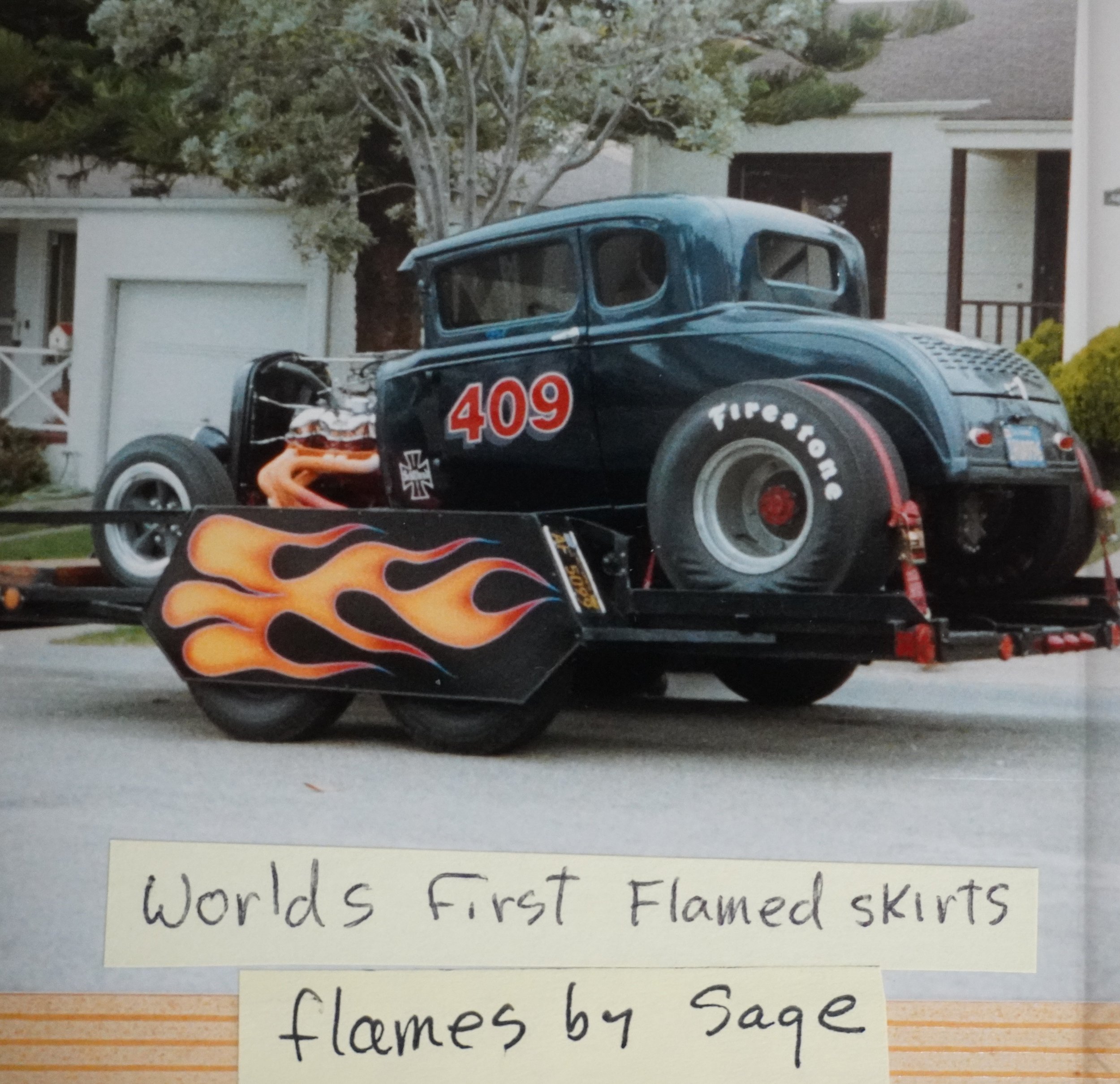 Here is my roadster that Gene owned and also had Dave Bell do the flames on in 1976. They have an unusual shape since they don't go through the louvers at all. And it was the first time Dave faded the stripes from color to color.