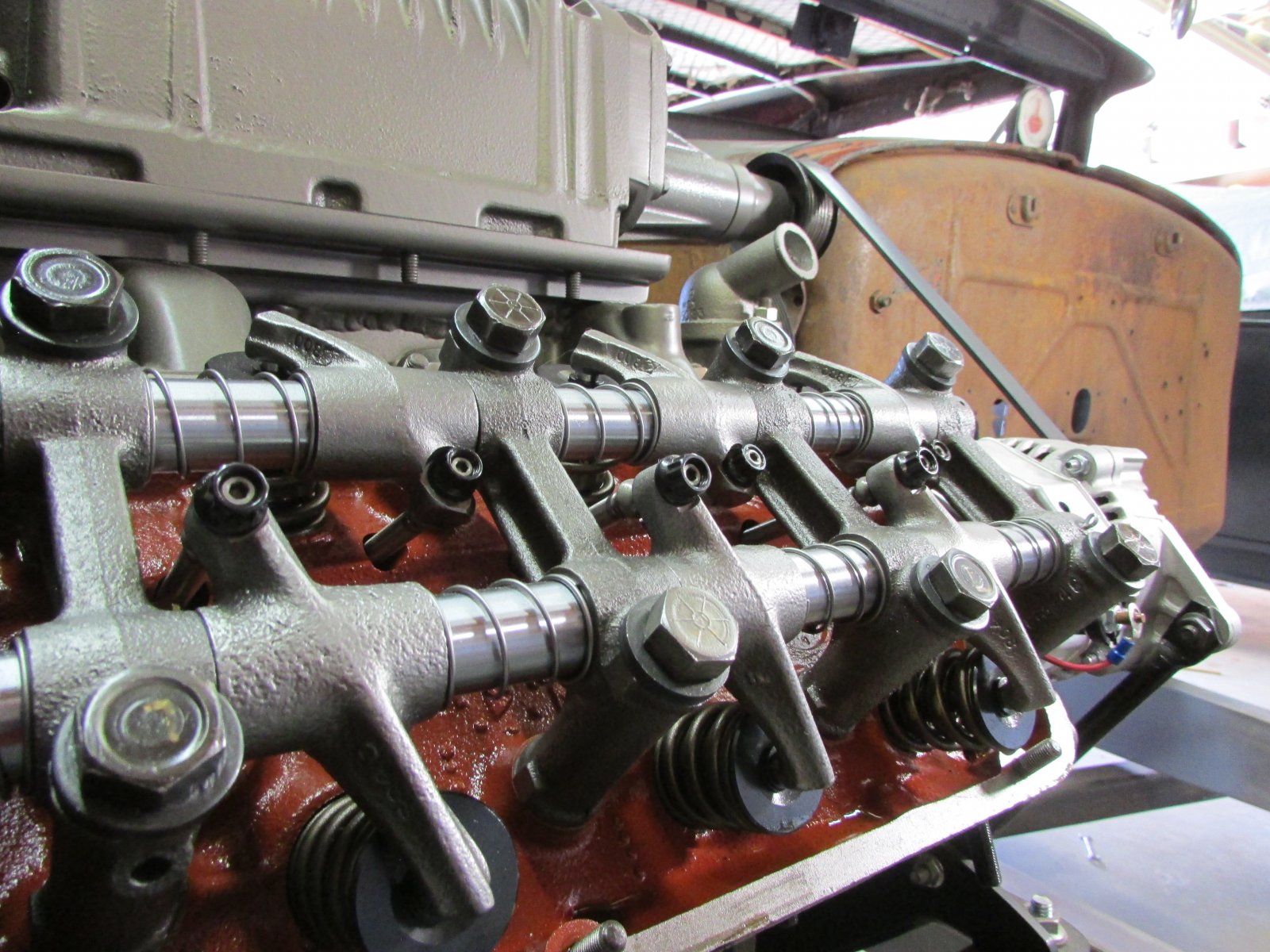 Here's a bit of a "sidebar" for those who may be of an Early Hemi persuasion. It's also an excuse for not making progress on the A Project. And, now I have experience I'll probably never use again. That said, my Roadster runs strong and no valve cover leaks after 70K miles. I really didn't want another project however, I consented to addressing the faintest of lifter noise after endless pestering by a good friend. I completely forgot what a PITA adjusting the lifers was. In fact, dunno how I pulled it off in the first place even with the engine originally of a stand, not in a car. - Note, in the first pic, that you can barely see, much less access the adjuster nuts on the push rods. The intake push rods are beyond impossible. This is where I butchered several really good old tappet wrenches and I gained "experience!" I was not looking for . - Below is the valve train of the engine featured in this thread. Although Chrysler supplied adjustable rockers on limited Dodge and Chrysler engines, they are heavy, extremely rare and very expensive, if you can find them at all. This is the solution provided by one of our own. Not cheap but a bargain considering the alternative. Gary Stauffer www.qualityengineeredcomponents.com modifies and rebuilds your rocker assemblies. They look like jewelry when he has done his magic. I just like lookin at them!