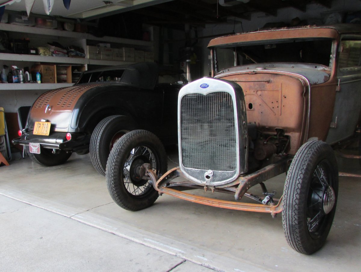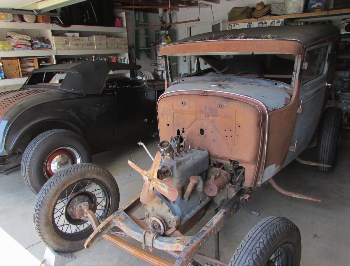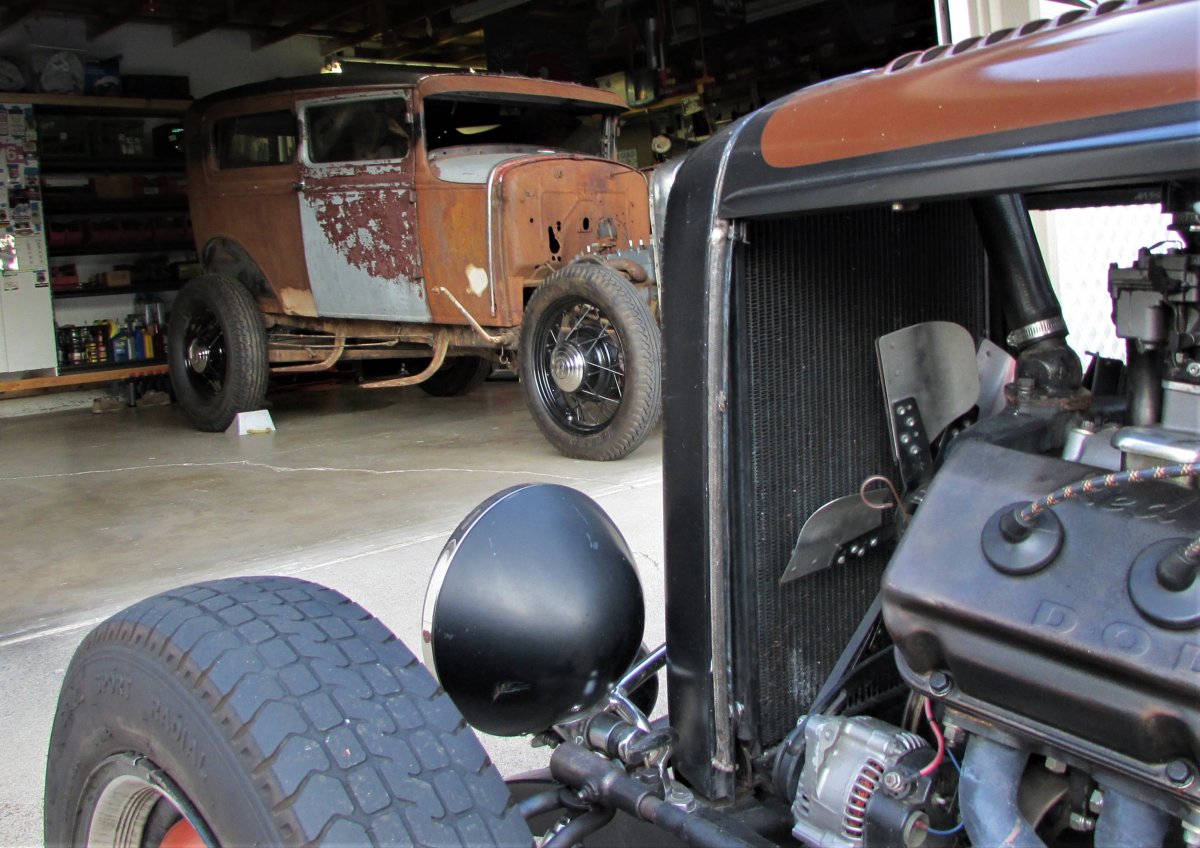 Well boys and girls,...seems like it's taking forever to make progress that I can share. I did have a week's distraction that I'll share at the end of this post. One thing I hate is billet parts. So I've congered up a way to take the edge offa parts, in this case the SBC water pump adapters, and then beat'em a bit with a pneumatic "scaler",....a Harbor Freight special. Matches up with the cast aluminum water pump pretty good IMO. Also scored a SBM serpentine crank pulley at the local wrecking yard to establish the plain of the serpentine system to drive the blower. Everything is now painted and purdy. Couldn't resist putting stuff together for a pic or two. And for the distraction,....I scored this A Tudor over the weekend. This was the answer to "whadda ya gonna put the Hemi in?" It came to me much earlier than expected, or needed, but all the stars aligned and it is now in my garage. The trick is, staying focused on the engine build and not fussing with the new toy.