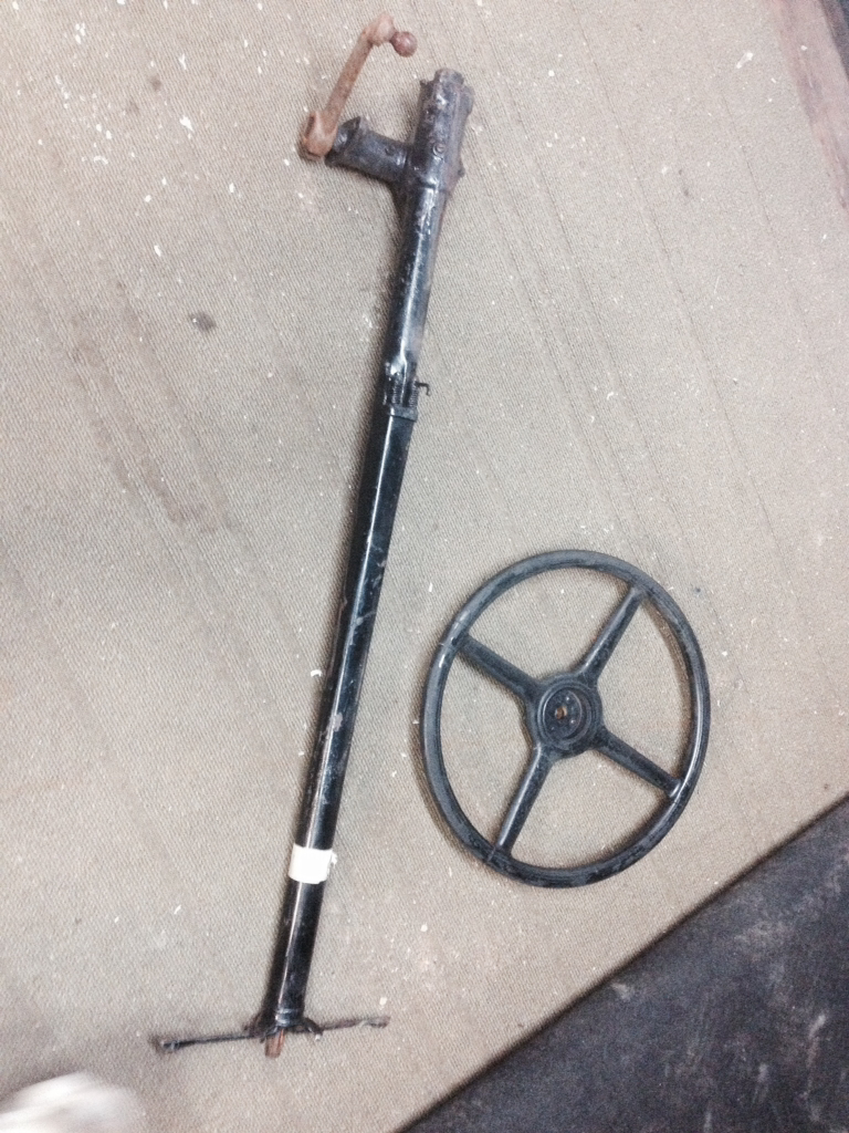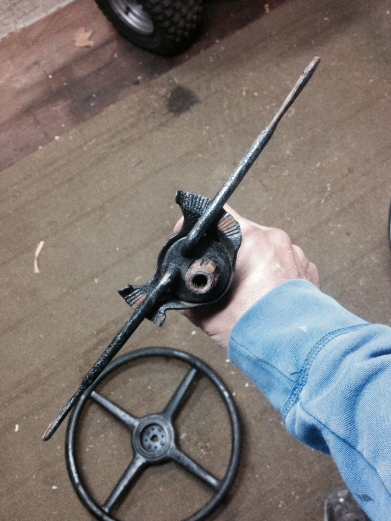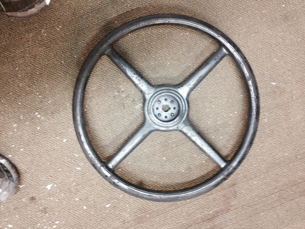 I removed the motor from the chassis this afternoon and took some measurements according to the plans/diagram and it's good. Not perfect but I wouldn't expect it to be. Definitely happy with the way it looked with the added angle iron removed from the side rails Here are a few pics of the column and wheel. It appears it's a 17" 4 spoke wheel but it's a two keyed shaft and the column has a spline on it so clearly they're not of the same make or model. I'd like to run wheel so it looks as if I'm going to be looking for a column if I can't mate the two.