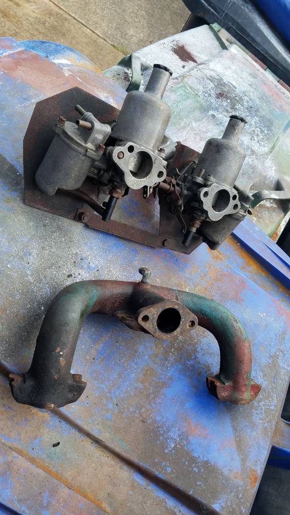 1. Remove down draft pipe with the old toilet bowl carb... 2. Make some flanges and pipes... 3. Bolt'em on... 4. Go Cruisin'. (They're from an 40-50's Austin, MG or something...Same as my charging system.) 5. Try to find or make stacks for'em (these are to big 1-3/4)