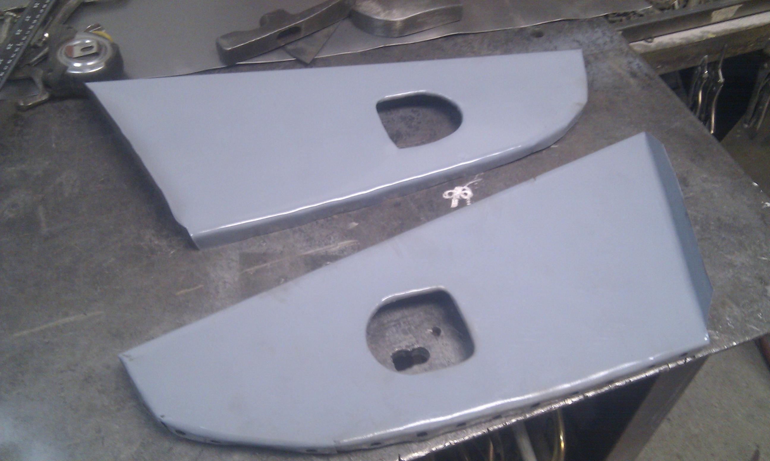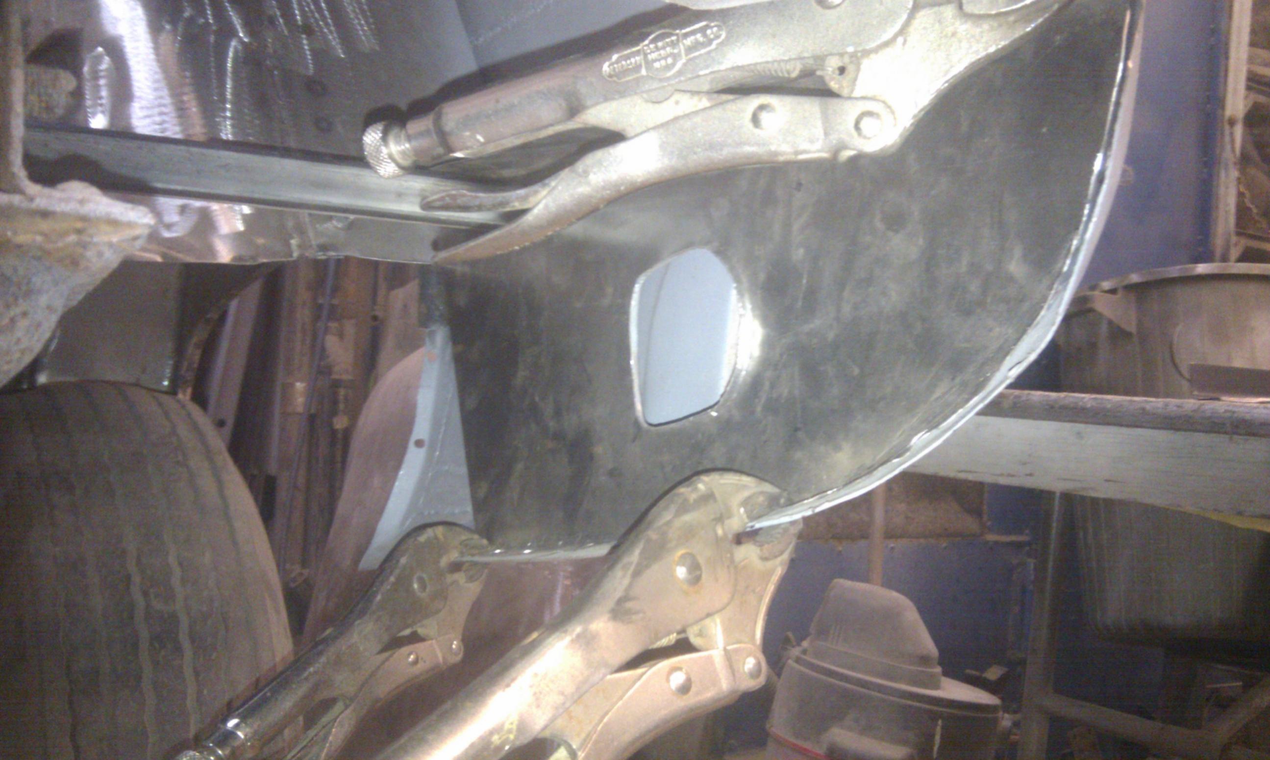 Had enough time yesterday as well to start on the braces..Had two strips left in my scrap pile fron both side trunk sections that were the same shape so I figure I put them to good use..Want to tie the rear body mounts to the upper part of the body so I bent up the scrap peice and trimed them to fit and added a lip to weld to both the floor and the wheel well as well as the trunk lip.now they were a bit plain so marke out a hole in the top side and bent a lip to give the peice a little bit of stile. you can see what I started with on the right and what I come up with. took me about 20 mins to make the finshed one!. also here is a few angles on how they fit in place.. will pick at these the week and finsh them up then I need to make two for the rear body as well.