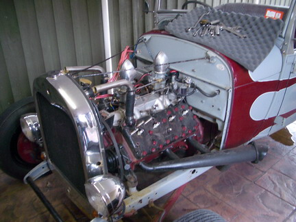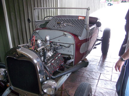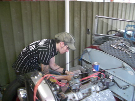 Heres some pix of the wrenchin' we did on Danny's A bone on Sunday. Pulled the old truck heads and replaced em with some Offy 400's with centre neck outlets. Although it doesnt seem to leak, will prob have to pull the pass side head to drill and tap that hole too, what a PITA hehe !! Thought I only had to tap the one on the distributor side. Note how Nooch is really gettin his hands real grubby by providing instruction from the drivers seat haha !! Ok OK ,he did some wrenchin' too ........right Nooch ? Rat