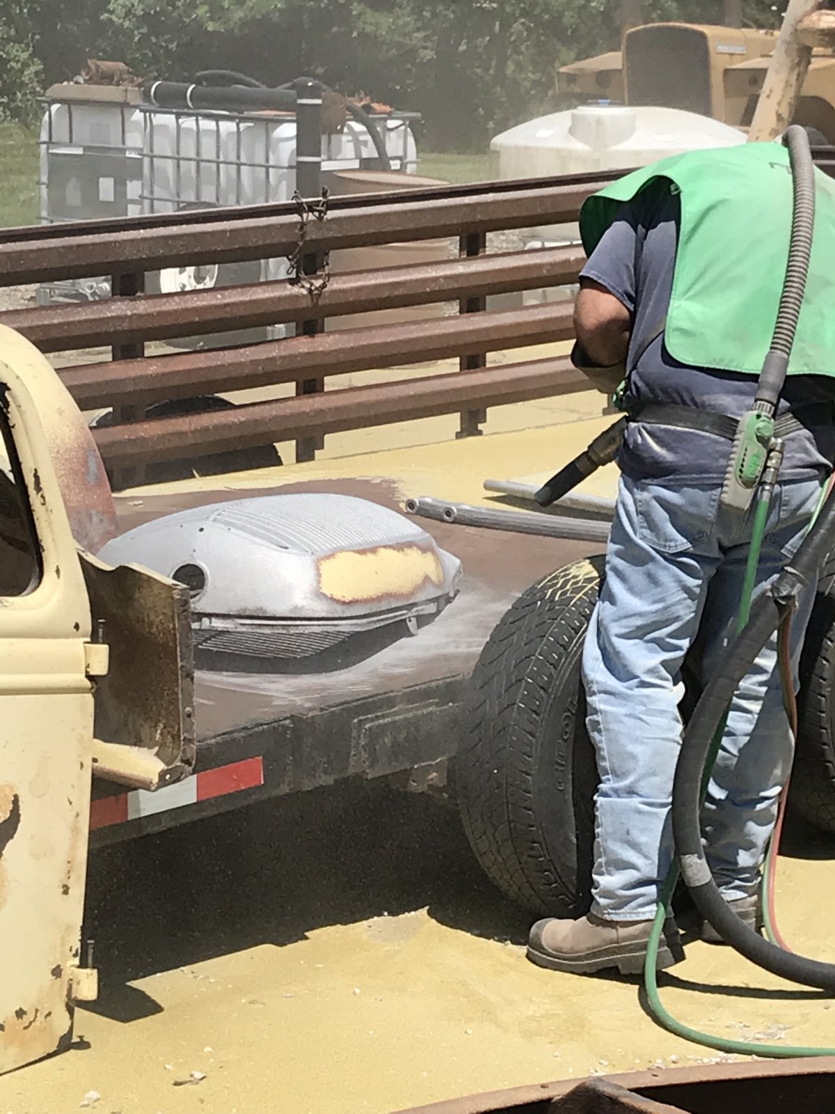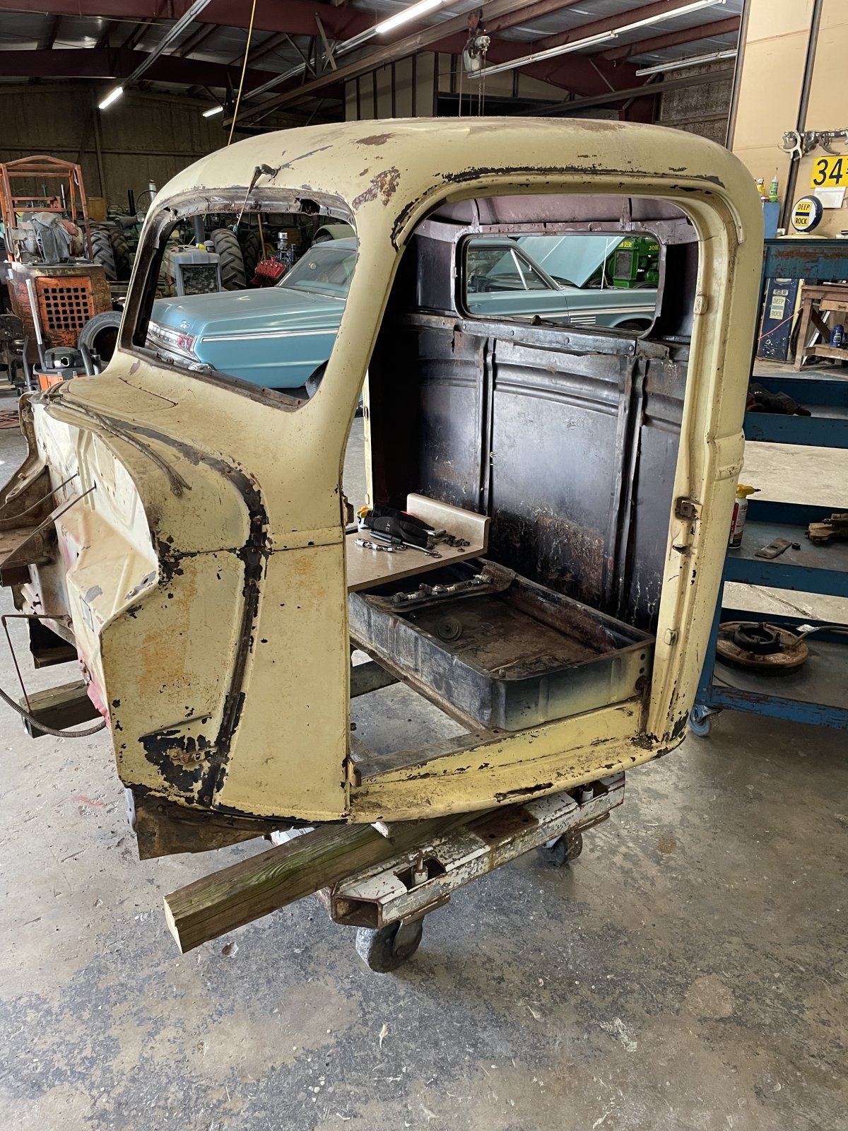 It’s been a while, but here’s an update. The truck is stripped to the bones, and everything was blasted and primed. I tore apart a couple of spare flatheads looking for useable parts. One was a Merc engine with a hole in the side of the pan from a thrown rod. The block was junk, but luckily the crank looks pretty good. There’s a local older gentleman with a large cache of parts who has offered some to me, so I’m hoping that there will be some good stuff there that will help us out.