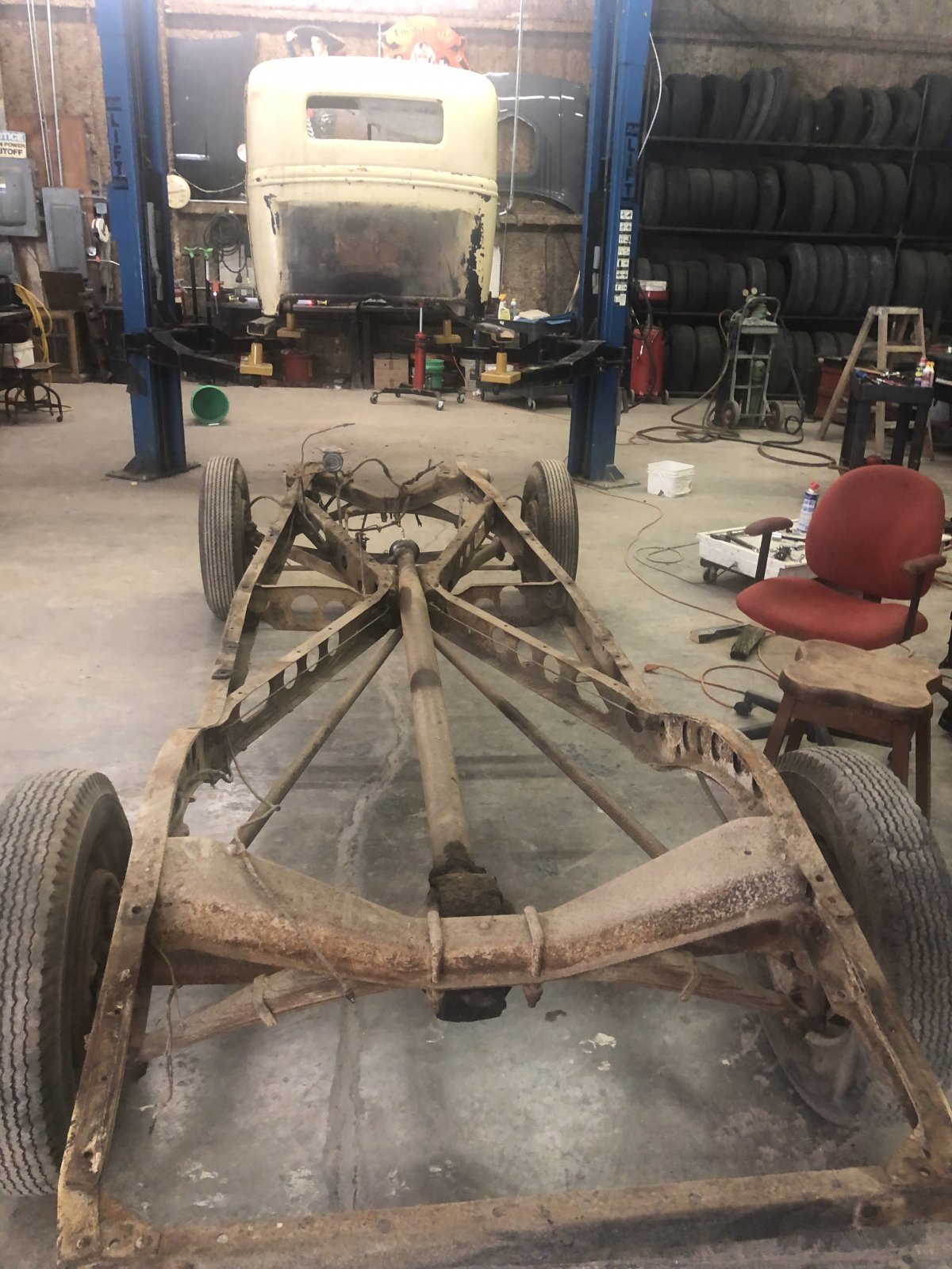 Dad got it stripped down to a rolling frame. We’ll peel it naked and then it’s off to the blaster to get cleaned up and a fresh powder coat. D7786ACE-1F71-4D3A-8857-4B8C6A4E69EA.jpeg