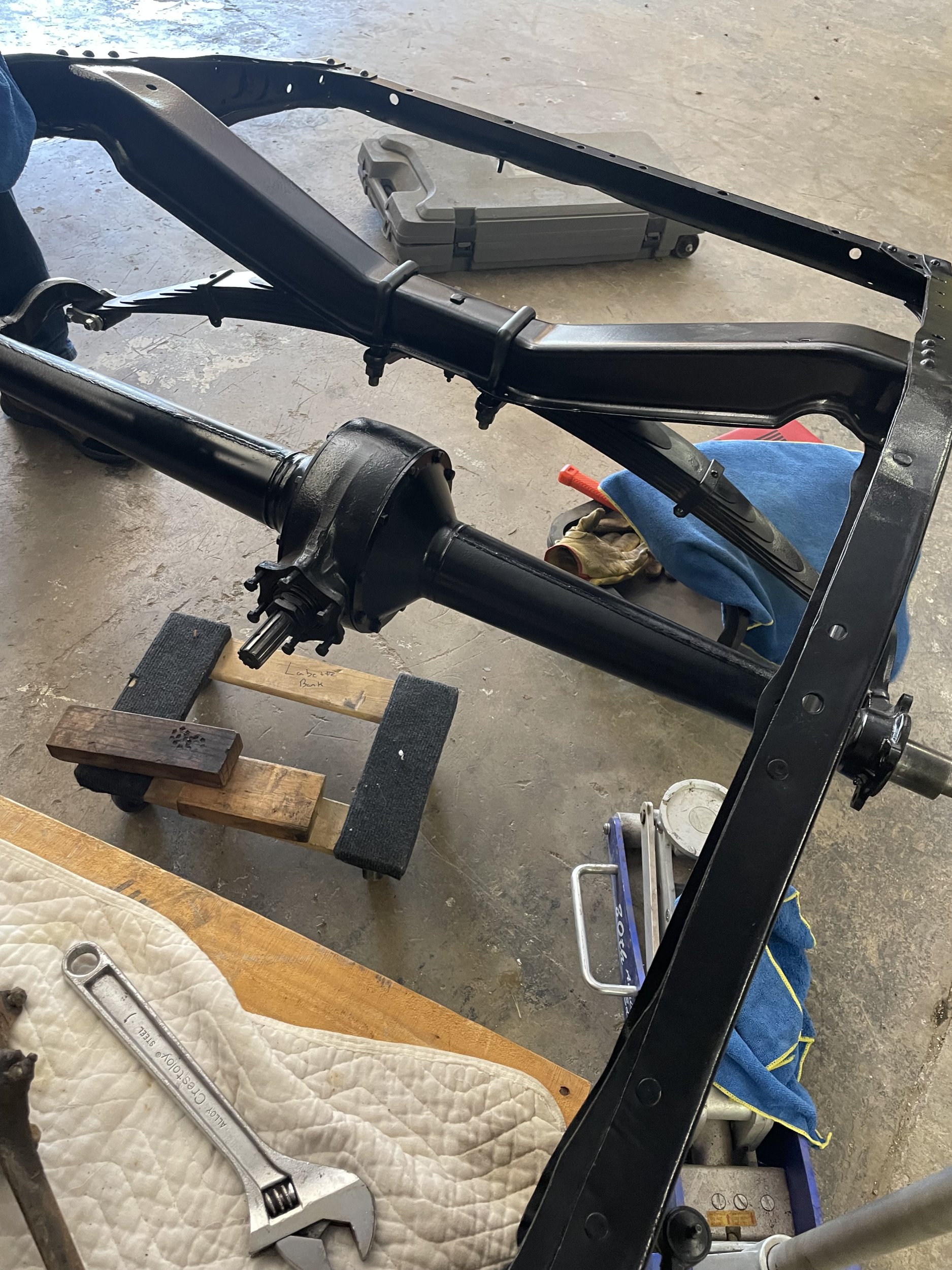 So I buzzed over to dad’s shop with the axle and spring today, and asked dad how he took it apart. He used his porta power. So that’s how we got it back together today. This was not for the faint of heart or the safety minded individual. It was sketchy, but it worked.