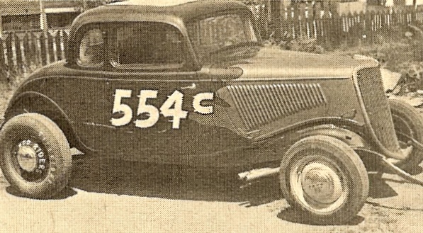 This photo shows us the back of his '34 sedan, on which Gene lettered his affiliation with the Rod Riders of San Pedro. In 1953, he still continued to race on the dry lakes, but he also began drag racing more frequently, too. He also picked up a couple of new partners that year. At Pomona on January 18, he and Balck (or Black?) took the '34 sedan to a C Fuel Coupe victory with 102 mph. On March 22, he partnered with Baker for a win in the light coupe and sedan class at Santa Ana with a speed of 106.38 mph.