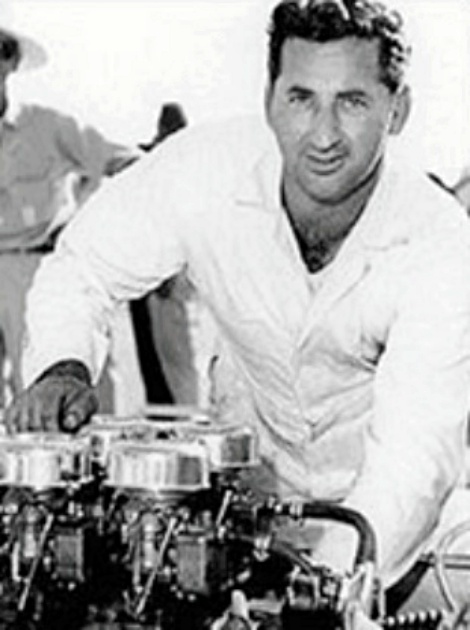 In this photo, Al looks at a later rebuild of his old car. In 1953, he co-founded Venolia Piston Company with Bob Toros. After 1963, he left racing and devoted full time to his racing equipment business ventures. Al was something else--World War II vet, innovator, businessman, machinist, pattern maker. He built Ford flathead equipment. He and Gene built and sold some of the first aluminum heads for the Chrysler Hemi. He helped Craig Breedlove with his Spirit of America record-setting runs. His manifolds and valve covers graced the twin mills of the Hurst Hairy Olds. And on and on. He was a guy who loved to make things that made you go faster. He died in 2004.