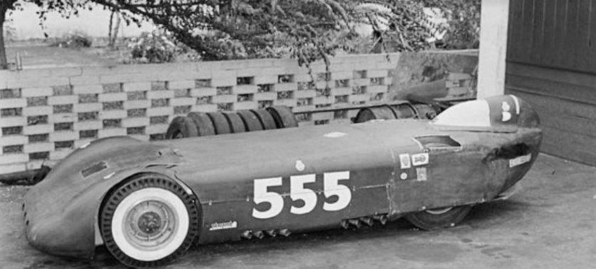 This photo was published in Drag News (3/2/56) reporting the race at Colton on February 26. Here we learn that the owner was Vincent Solgat and Brollier was the driver. We can only speculate, but Sam was the sole breadwinner at home. He may have needed to spend less on race cars and more on the family. You know. Happy wife, happy life. Anyway, he sold the car to Solgat, but continued as driver. But there was another reason Sam sold his Fiat--he had bought another race car. And this one came with a pedigree.