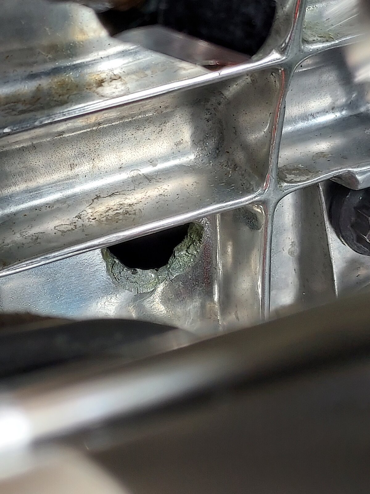 30. Its not completely junk. Its very fixable. Usually the whole section with the oil pan rail is taken out. It looks like something got between the broken rod and the block. Then pushed it out. Its a perfect hole. The engine will be out tomorrow.
