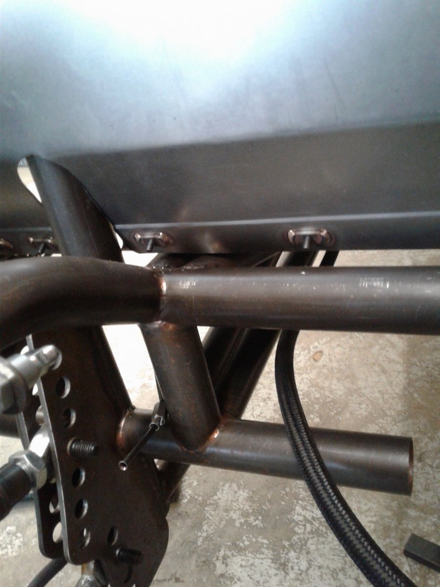 3. They say the devil is in the details. It certainly is when it comes to the sheet metal work. At first glance the details dont show. After looking closely they start to appear. Things like rolled edges done with a leather hammer. Or the drilled and tapped tabs brazed onto the panels so pieces can be screwed together. i don't want everything vibrating. The tubes are exposed for future chassis certifications. If everything was covered up holes would need to be put in for access. 20160527_161448.jpg 20160527_161519.jpg 20160527_164316.jpg 20160527_164345.jpg All of the overlapping pieces have a step in them so it all lays flat. The floor is removable. the edges need to be trimmed and rolled after the body goes back on. With the floor being steel i need to powder coat it. Im leaning toward a apple green. That way all of the details can be seen. On the other front i helped get the body onto the dollie so it can go into the paint booth. it will be painted this saturday or on tuesday.