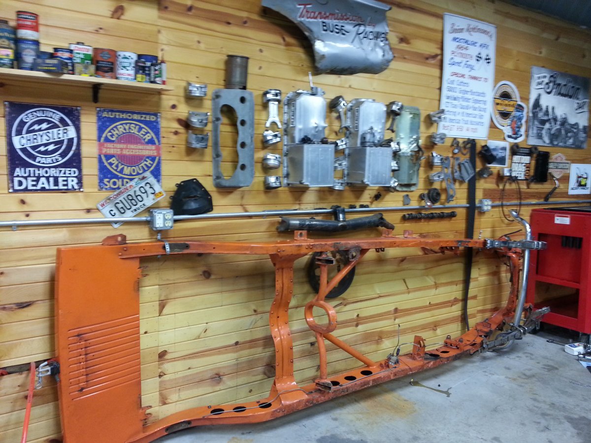 I was out of town this weekend so not to much was done on the car. I did clear out a area in the shop for the frame. Its now strapped to the wall in my offerings to the gods of speed. Maybe some day i can tell my grand kids about walking away from the wreck. That is if my kids give me some. I got alot of shop cleaning time in also. I had quite the mess going after blowing the car apart. The old block and bellhousing are loaded in the truck. I will drop them off monday. They will be used for mock up.