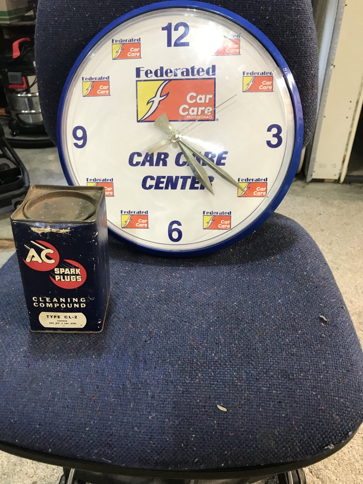 My Iola swap meet haul. The signs were all really cheap, ranging in price from $5 to $30. Just stuff for the new garage walls. The steering wheel looks like Mercury Turnpike Cruiser but it has no splines and it does have a keyway. Anyone know what would have used that wheel with a key instead of splines? The hubcaps are kinda ugly but I really like the spinners on them and would like to find two more. The back side looks like it says Gay Lord wire wheel disc but it's really hard to read. Anyone know anything more about those? Might be hard to make up a set of 4, but I'll be looking.