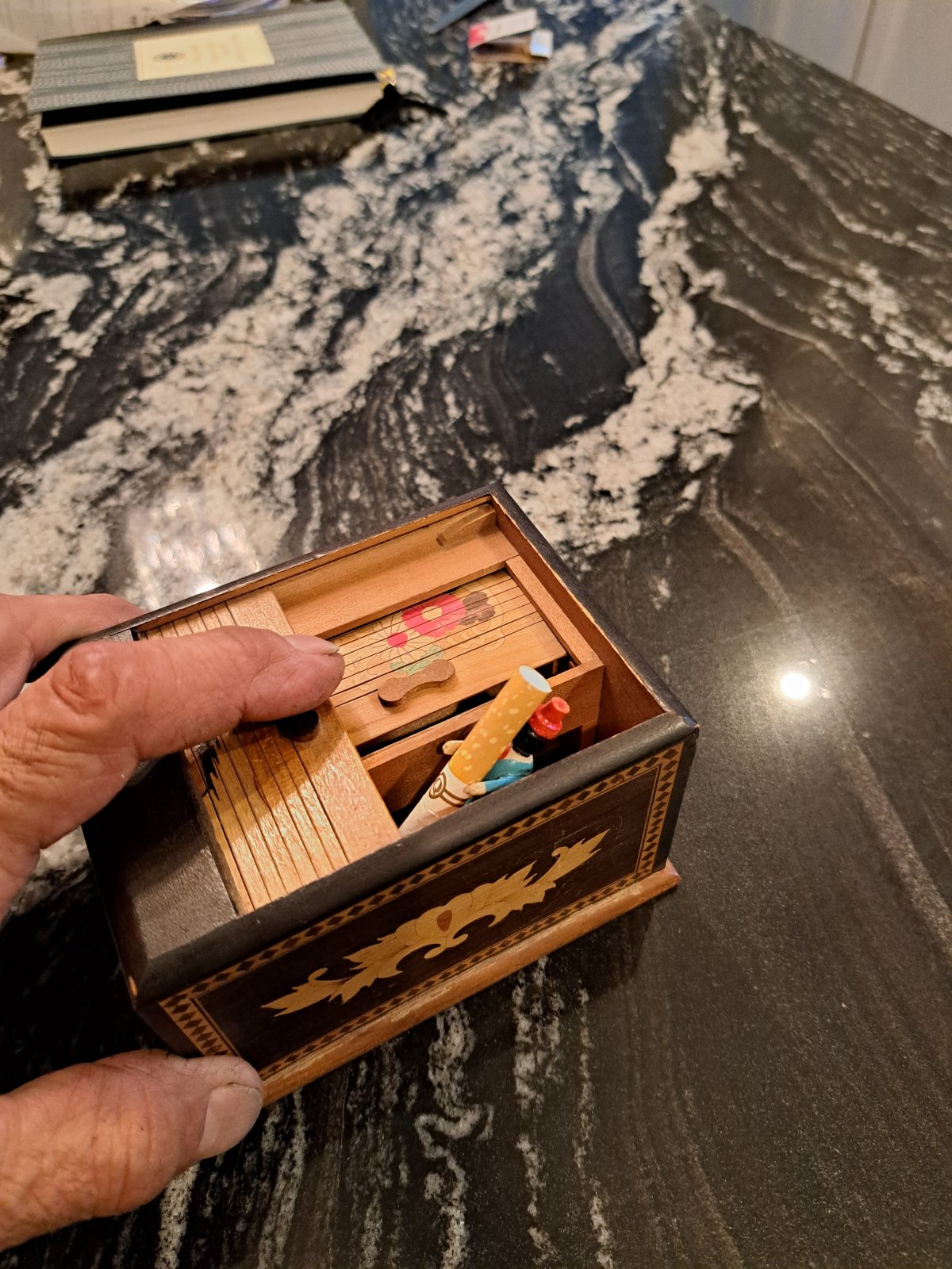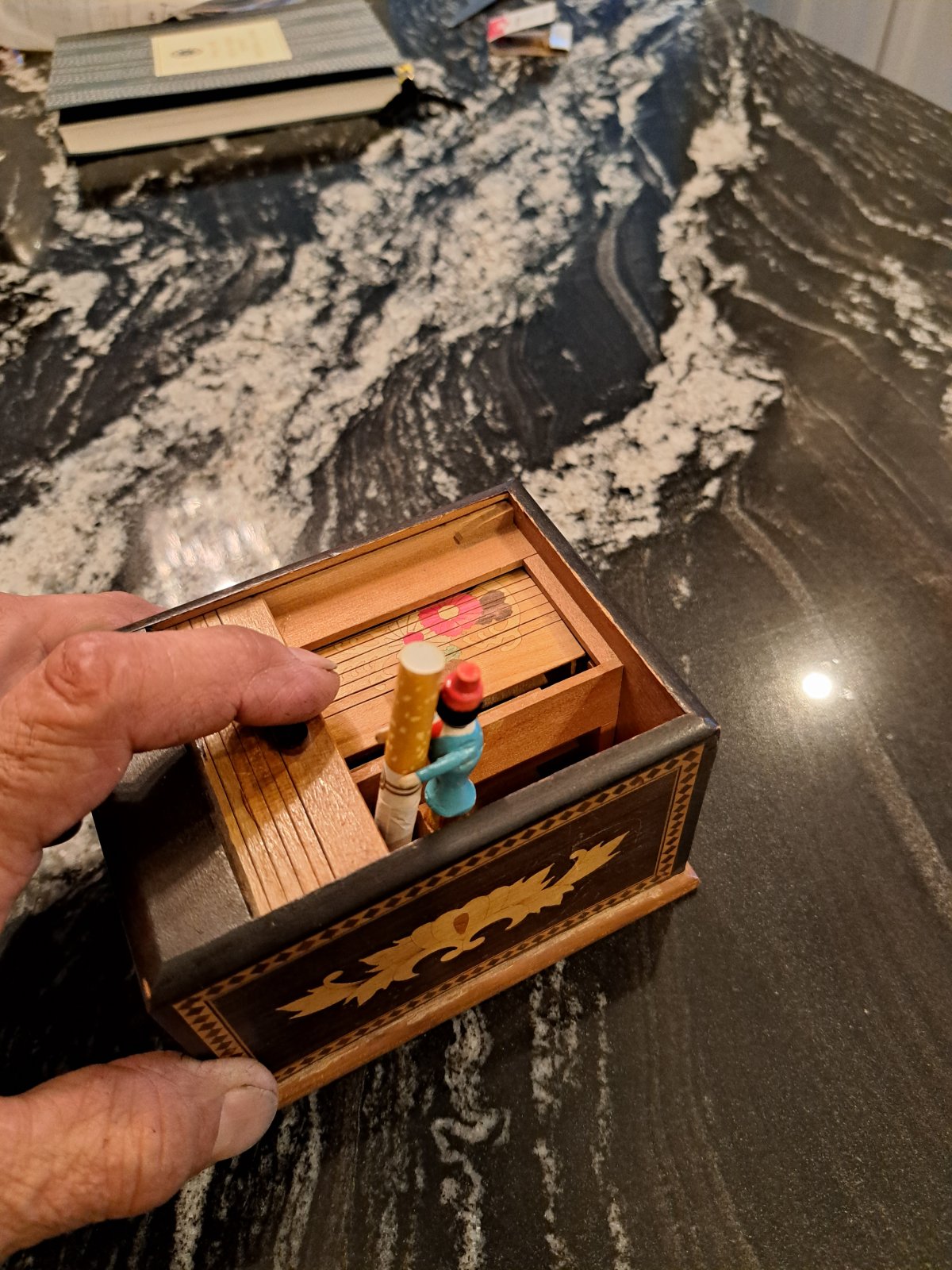 I've got a box which is similar to the one shown here, but with a different inlay top: https://www.atlasantiques.co.uk/en-...y-cigarette-dispenser-box-with-dog/prod_11745 My grandmother gave it to me 40 years ago. Had to do a similar thing - ask her for a cigarette then cut the end off to make it fit. Cheers, Harv