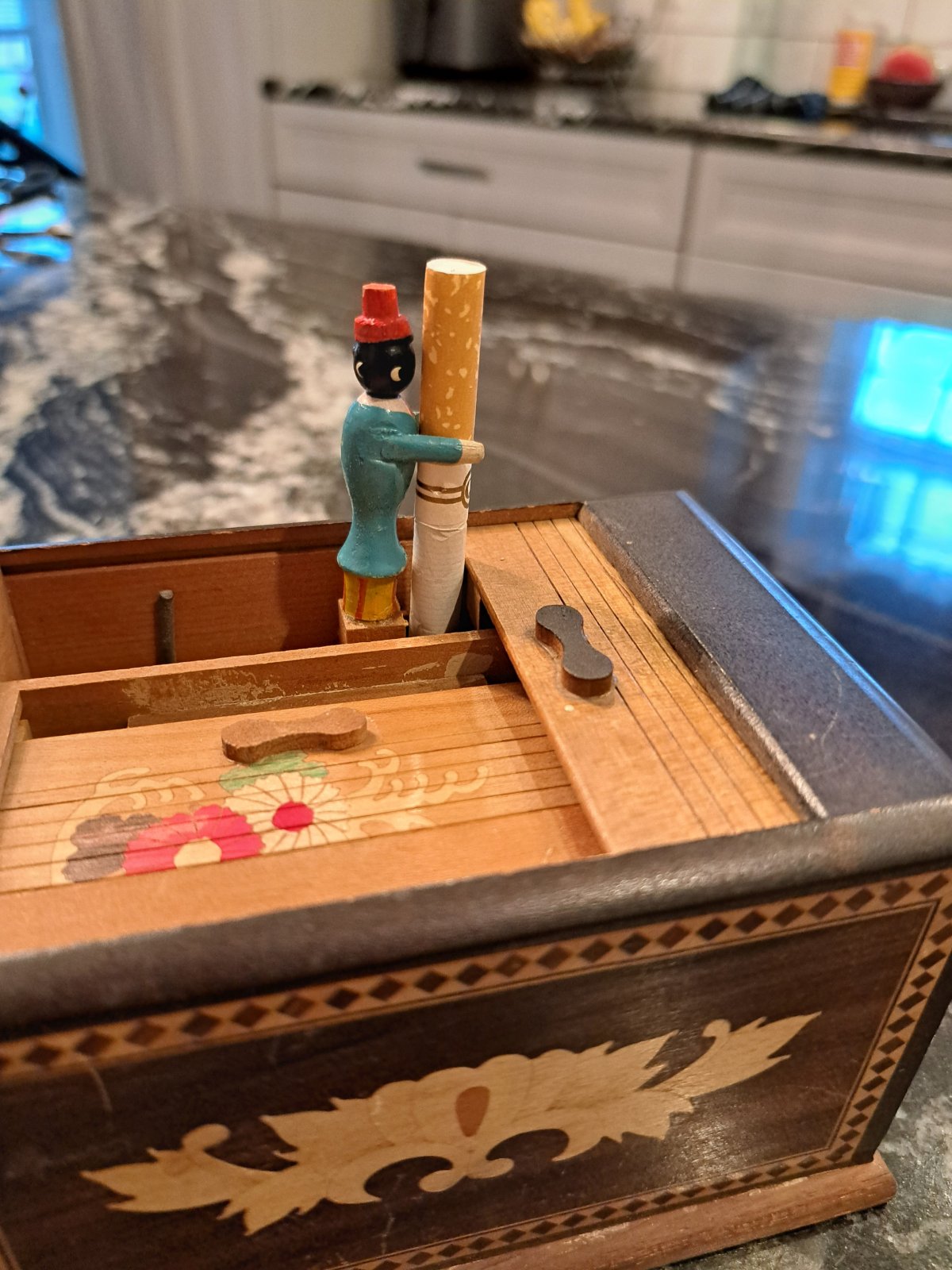 Father in law gave this to me Wednesday. His grandfather bought it at the New York world fair, 1933. That's what's written on the bottom. You put cigarettes in it. It loads them so the little guy pops up and hands them to you one at a time when the door is rolled back. The art work on the sides is inlaid wood. Gave 'em up 30 years ago, had to bum one and shorten it to the same length as pre-filter era cigarettes so it would work right.