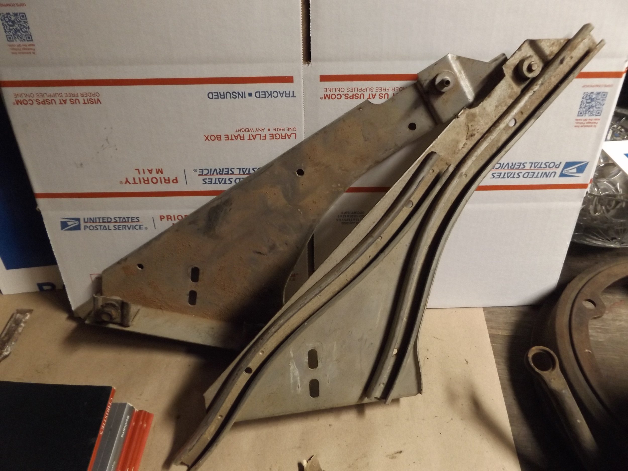Found in a bunch of Flathead to mid 1960's Ford parts. I'm guessing hood hinges, I have both sides. looks like a Lionel track connector but it isn't. Quarter window Regulator Tracks???