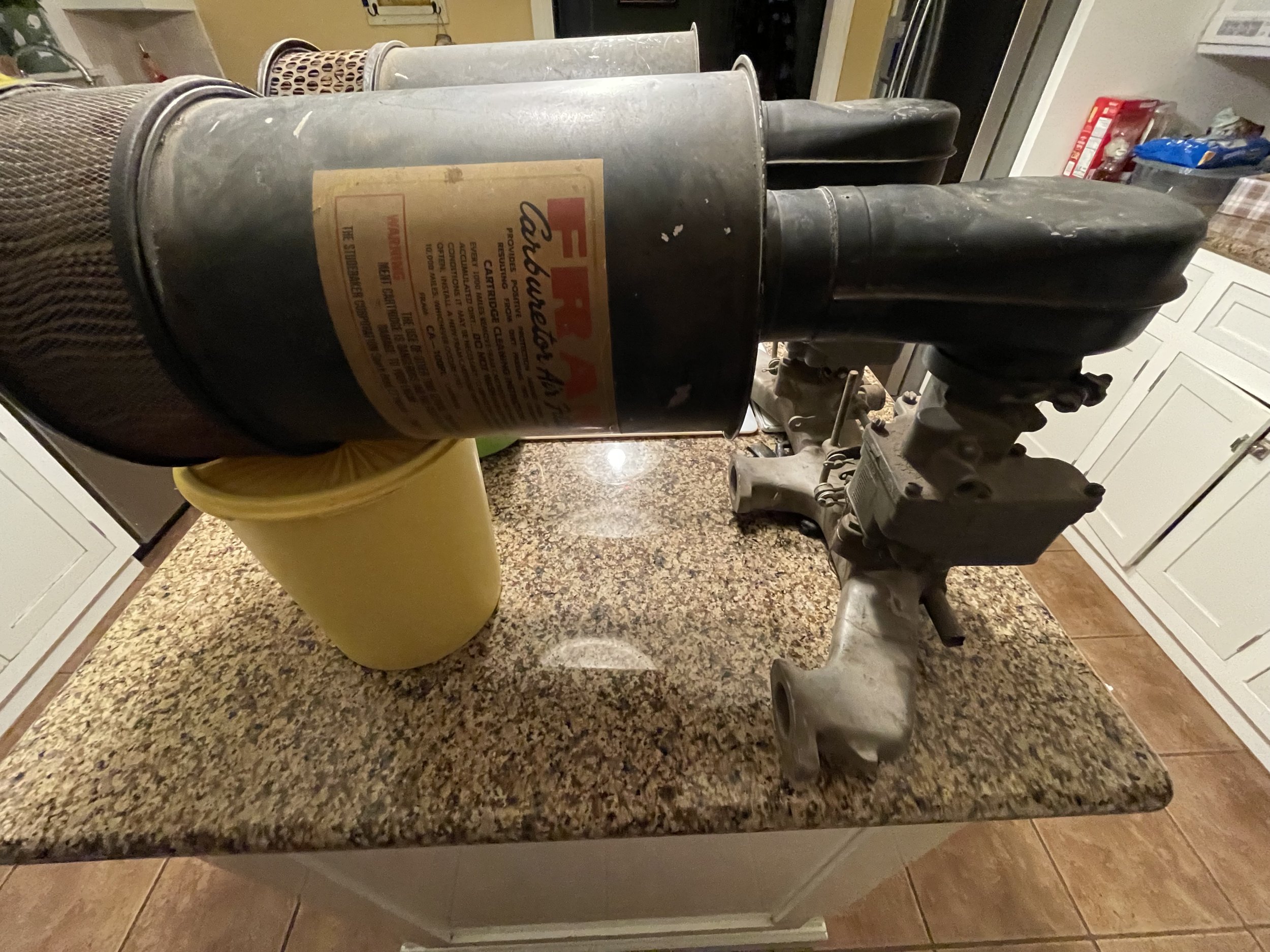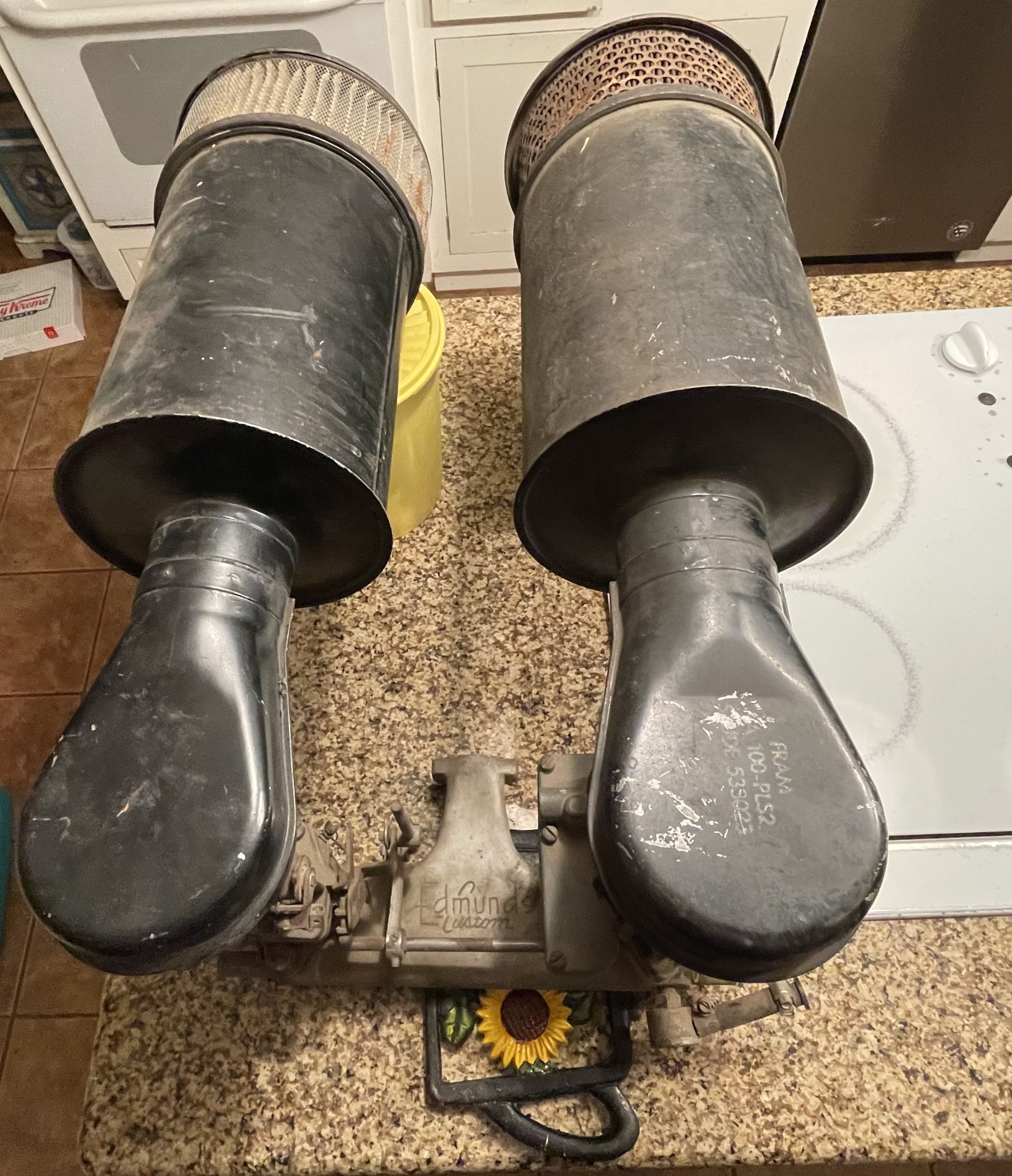 A pair of stude air cleaners. Mocked up in the kitchen with the wife’s vintage Tupperware I kind like it on this Edmunds set up.
