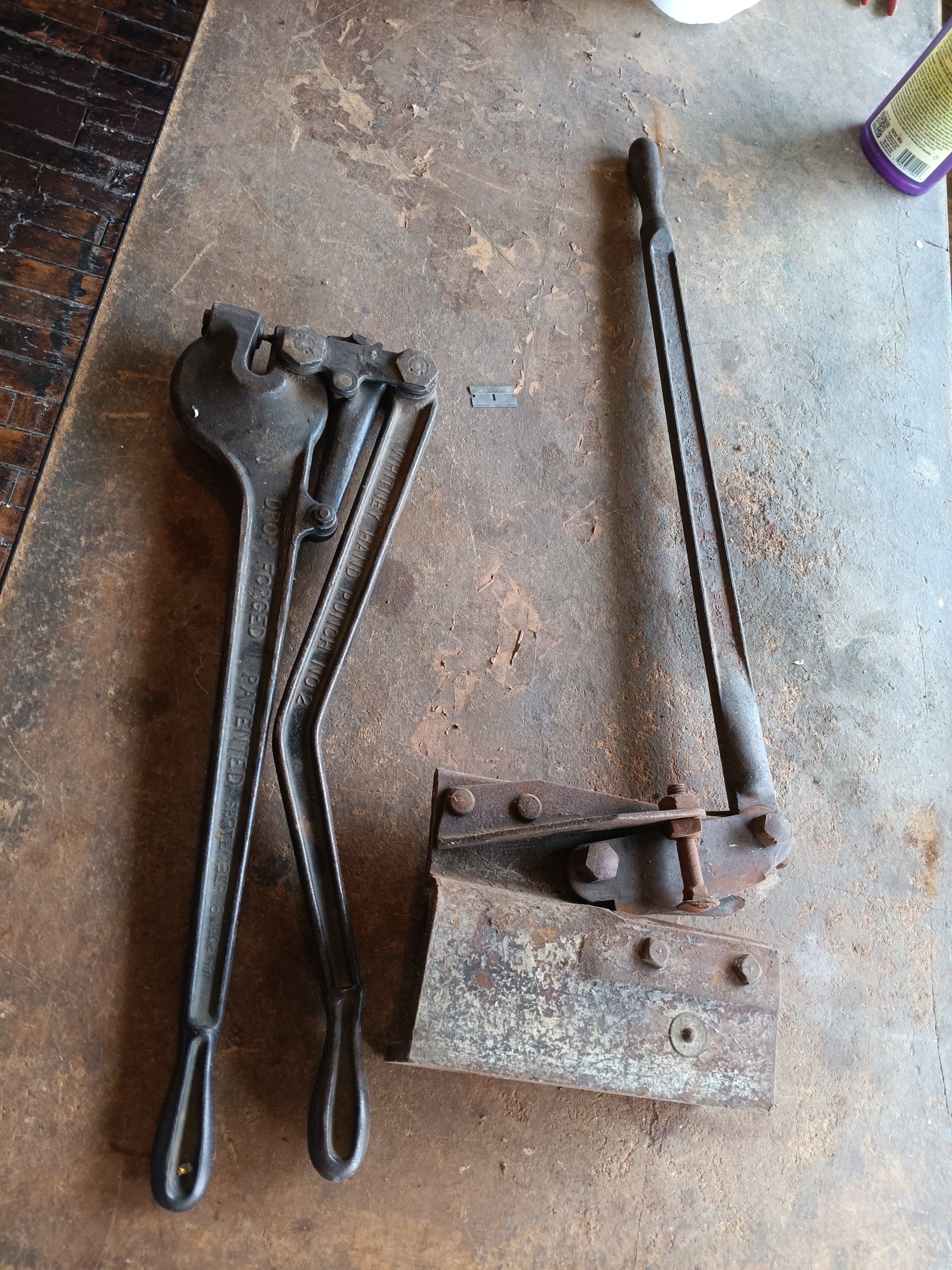 Got a velvet rope at an auction last night for 5 bucks, thought it'd be fun to put it in my garage but not sure how to set it up yet. Also got this big Whitney punch which is in very nice shape, although I kinda wish the die it came with was a bit bigger, and the piece I was really after, this shear. It's not a Beverly but I'm hoping it works the same more or less, it's very heavy, needs a thorough cleanup but the blades aren't beat up, and hard to complain for the price. Bought the pair for $7.50