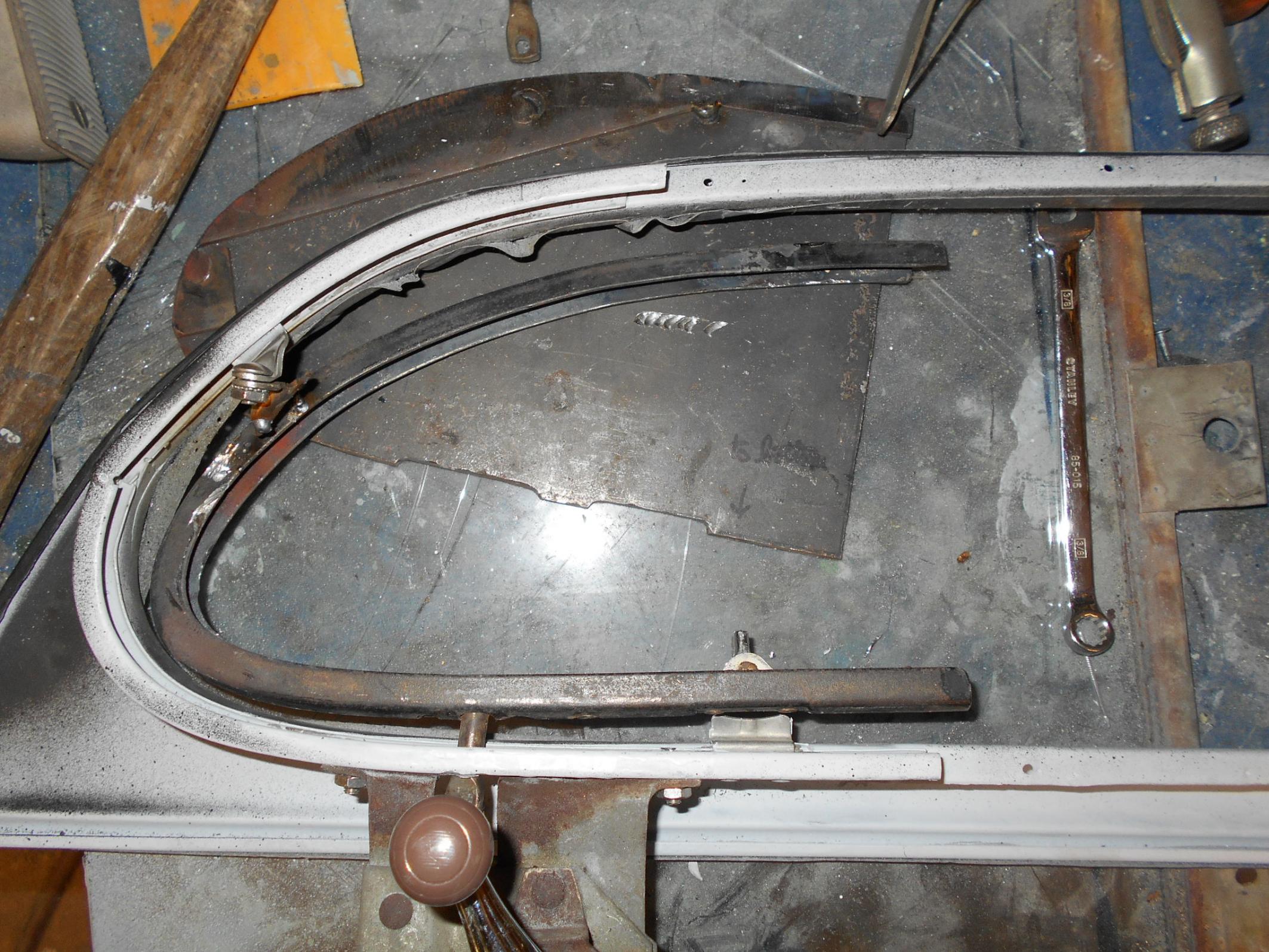 I've got two sets of vent wing frames. One is black steel and, one is stainless. I'm using the black steel frames because they're easier to work with. I've made a buck that mimics the glass width with the seal. I'm using heat to form the correct shape. I will have them chromed. I sure would appreciate any pointers/tips on getting the upper pivot geometry correct so that the window will pivot out like its supposed to.