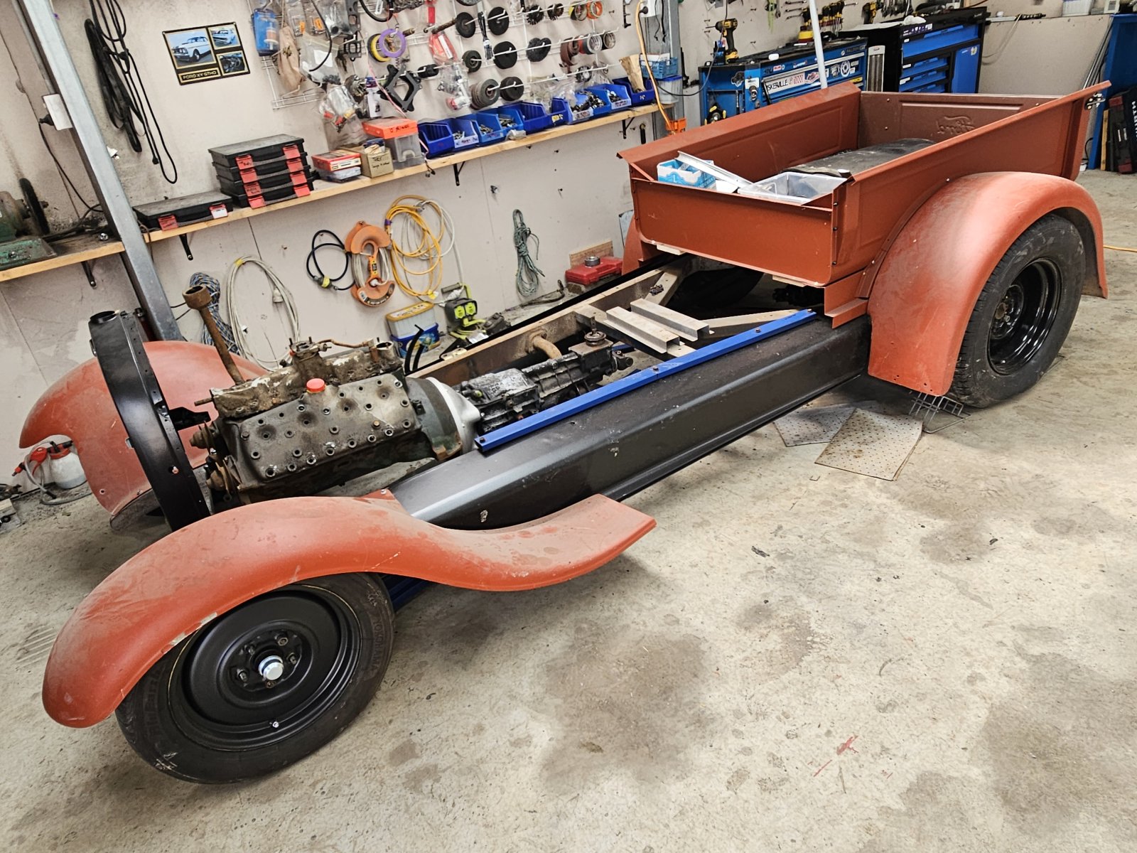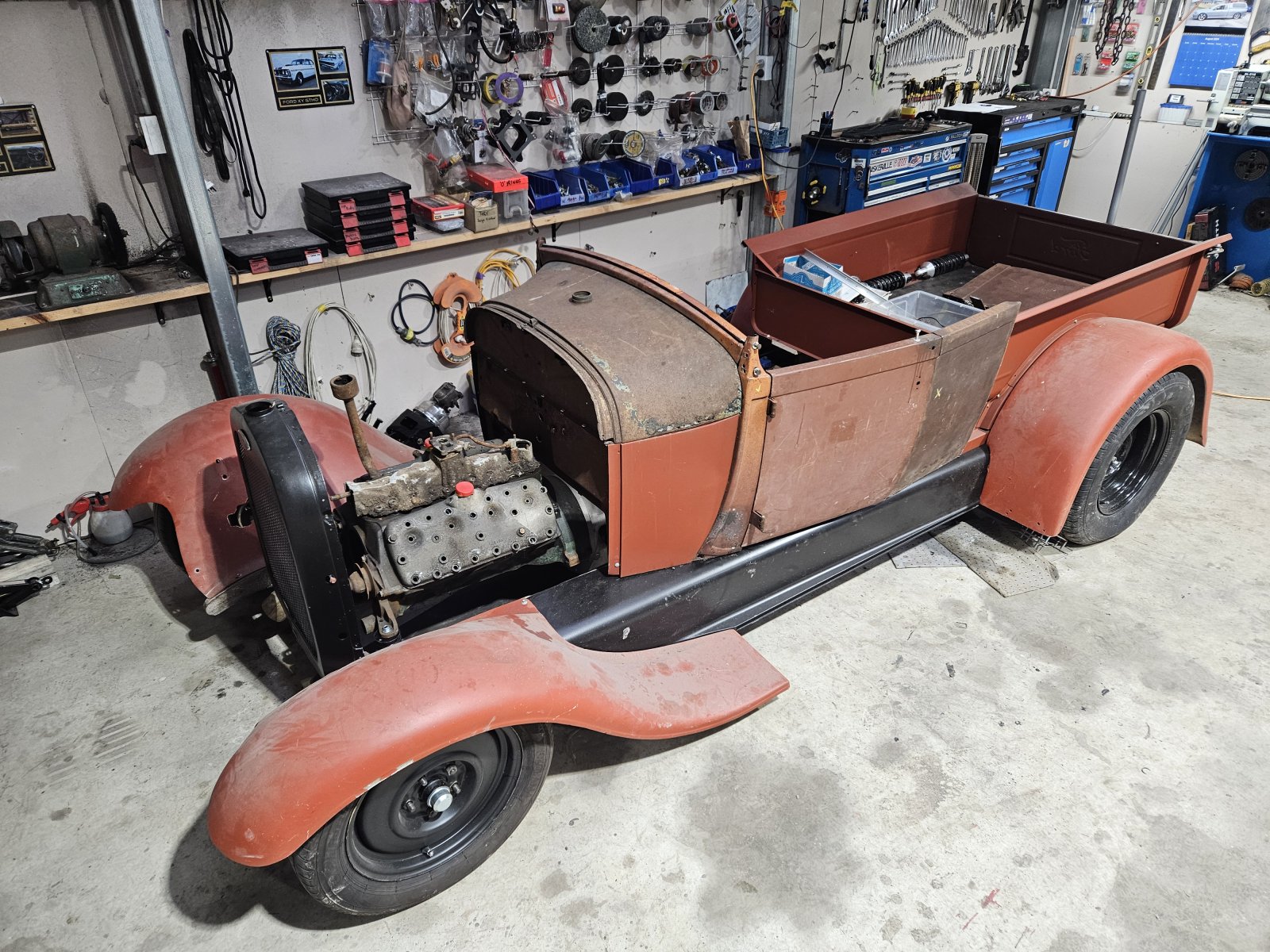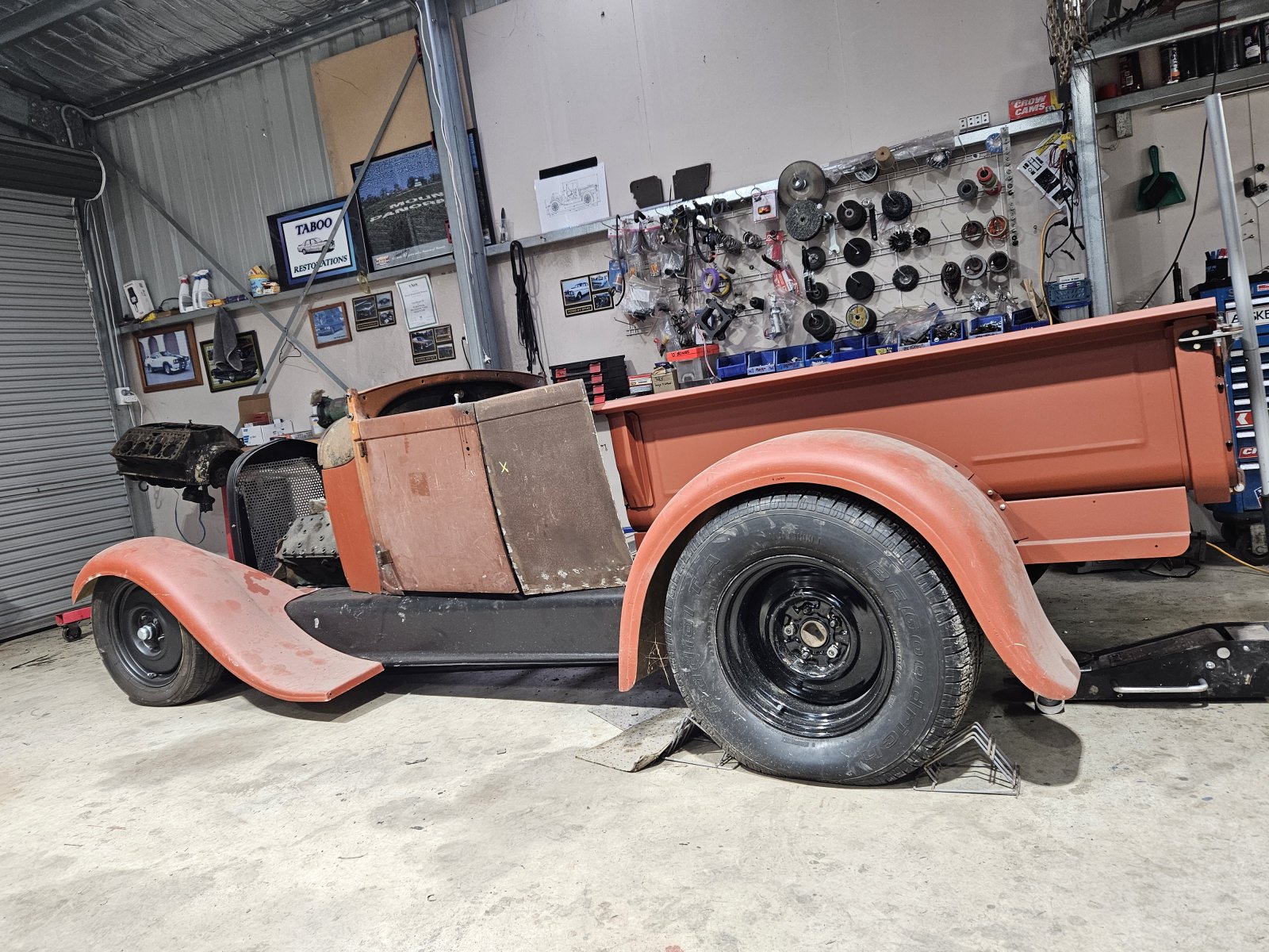 What rotors and calipers are those ? What is the rotor diameter ? I kind of like the look of the calipers for a Non HAMB type project . I have a 28 PU that came with a expensive shiny IRS and the frame is way to modifed to just cut it off and start over so its going to stay. ( for now ) At some point I may build up a new frame and traditional suspension and swap the body over some day . Should be a nice truck when your done .