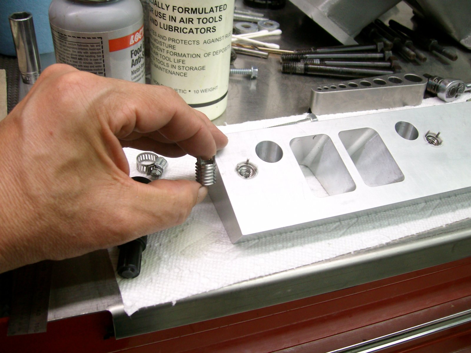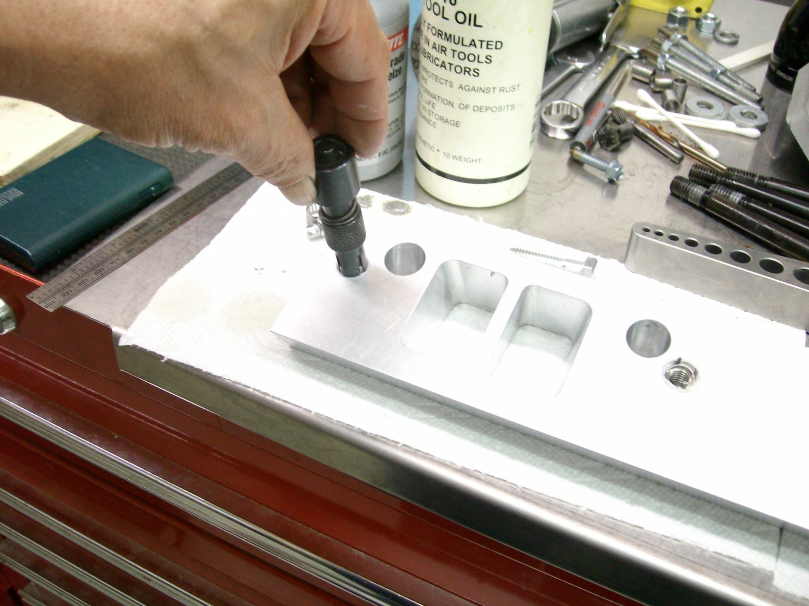 To be able to port the intake to the adapters you add the small notch added to the edge of the intake. This allows you to mount the adapters to the heads using only the four outboard corners, add the intake and then by using a "wobble" type Allen you can remove the adapters with the intake still in place. These are the Stude version, The Caddy would need the notch a bit farther to the right.
