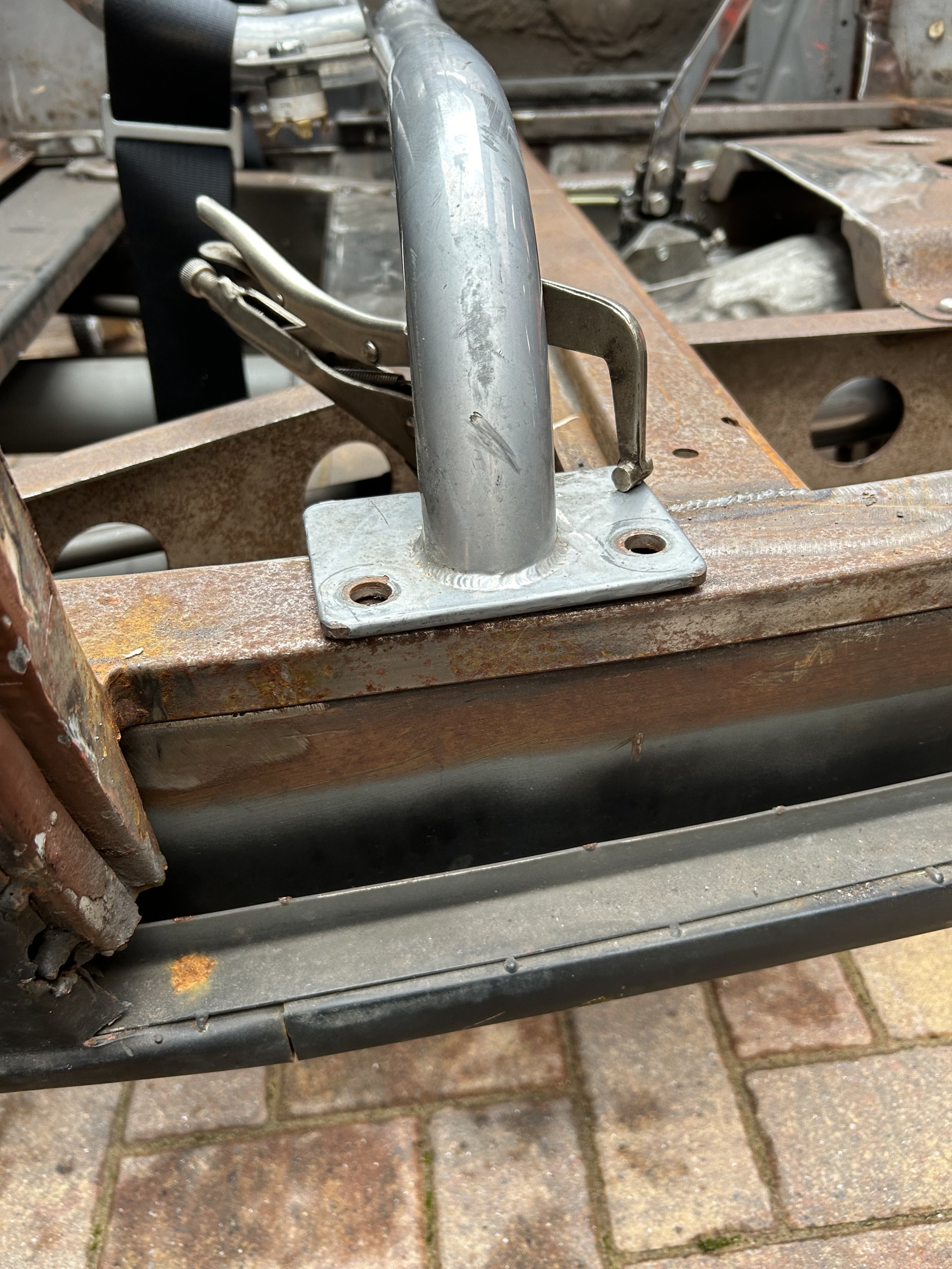 Some small updates. I ended up removing all the crossmembers for the roll cage I had as a much better one came up for sale which had already been built for a 32. It was fitted in a roadster but after measuring I was confident I could squeeze it into the confines of the coupe. I ended up dropping the mounting feet through the sub rail's both to gain some clearance and to satisfy the regulations, there are brackets on the inside of the frame to support the overhang. Next up is a to fabricate a bar to support the rear of the cage. At this point I had fabricated the floors in wood but my neighbour, who restores VW t3 vans, said they would look much better in steel and dropped a bead roller, shrinker/stretcher and folder round for me to borrow so, now that the metal has arrived I will attempt to fabricate them again.