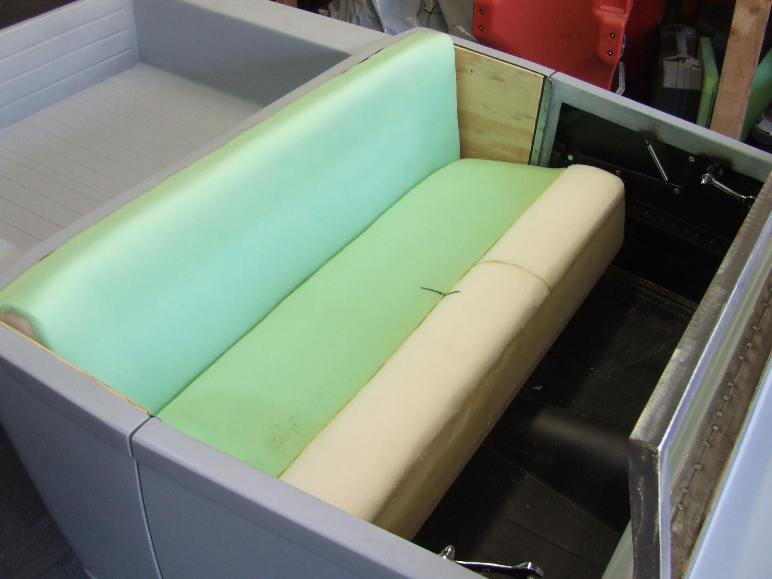 Hey guy's had a whole day to work on the rod! Started with the driver door interior and finished it. After looking at the completed interior I didn't like the bottom seat cushion it was not comfy. I hadn't cut openings in the bottom plywood prior to gluing the foam on. So I cut two square holes and stretched and laced webbing across the cutouts and cut the foam down. I then reglued the foam to the plywood and installed the cover. Here are some pics of the finished interior less carpet.