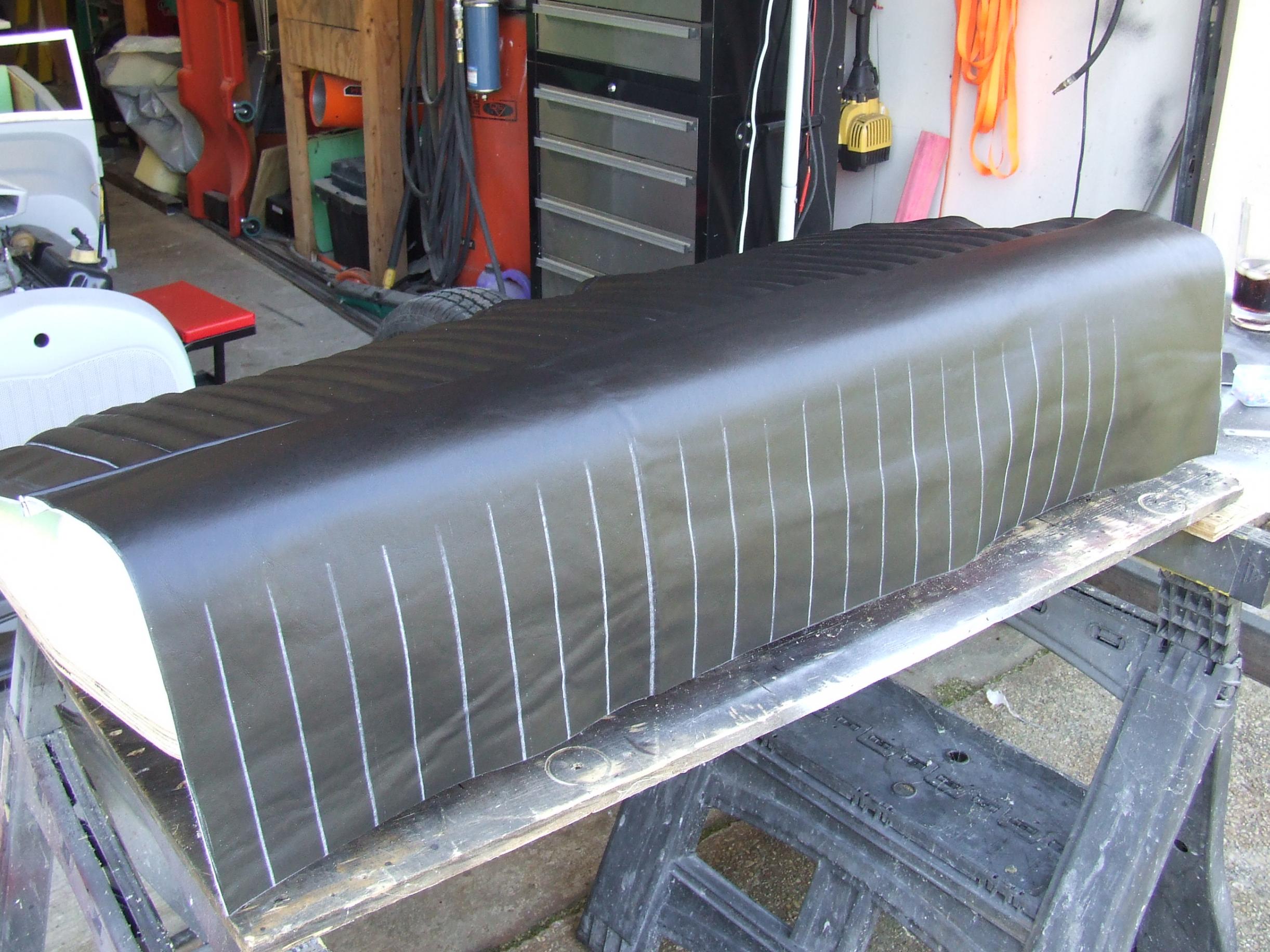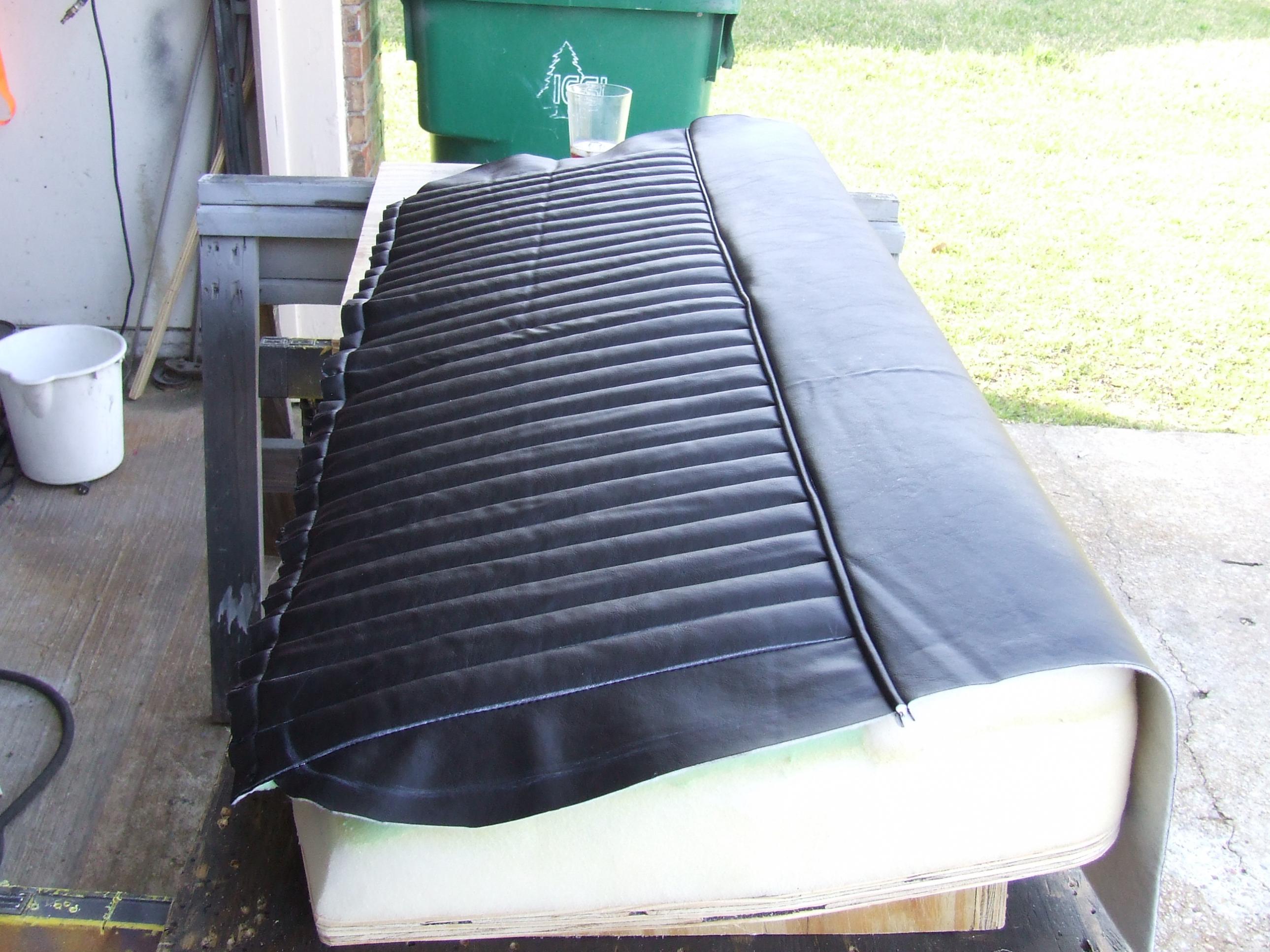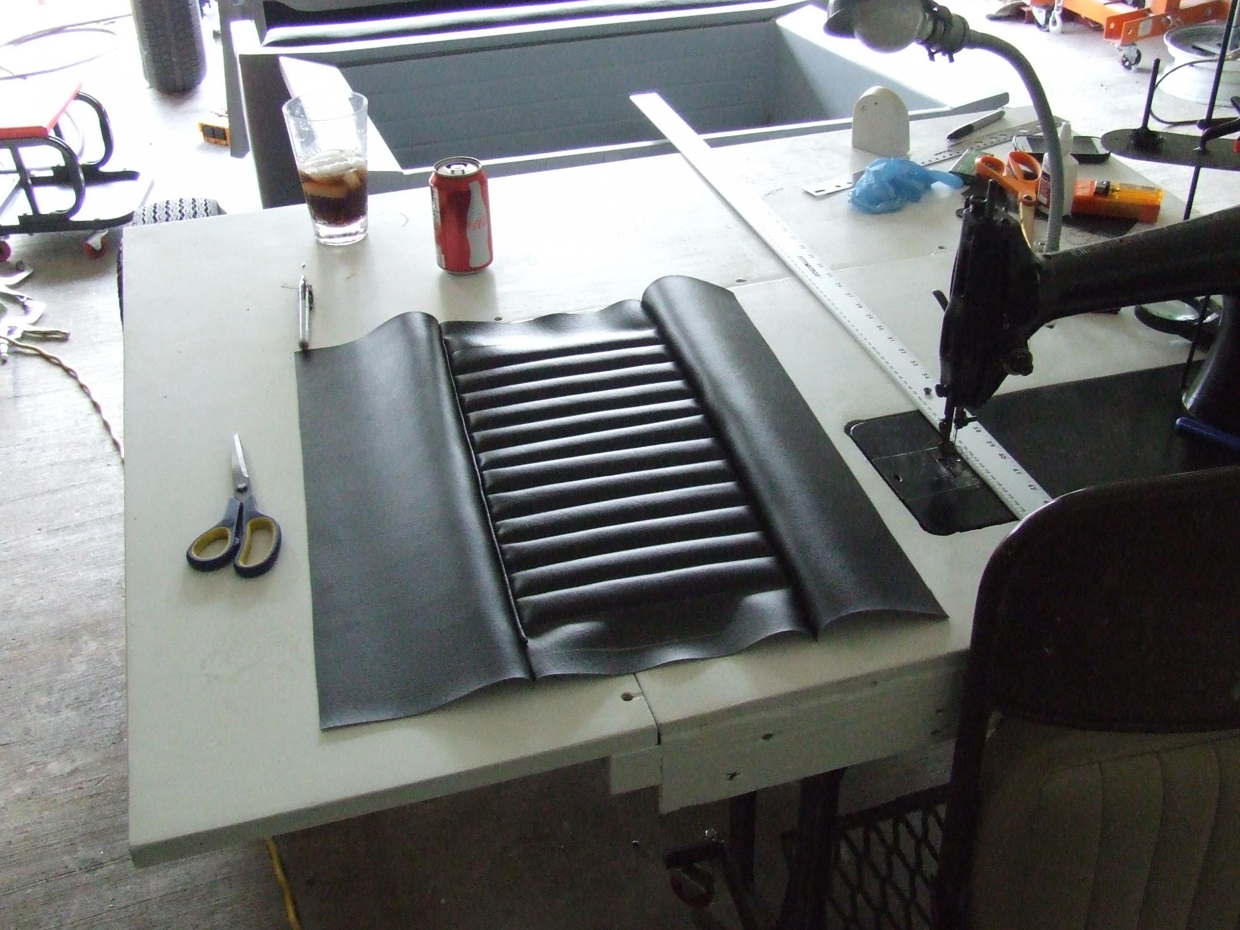Okay it's Saturday and I had already picked up the materials for the seat covers Friday so here goes. I first cut my patterns and then the material top is vinyl over 1/2 inch foam with muslin under the foam these were glue together prior to sewing. Marked out the pleats and sewed them thru the three layers of material this took awhile as I am out of practice. the Hardest part was making the edge welt. that required folding vinyl over a 5/32 inch cord and sewing it as close to the edge of the cord so it would be tight.