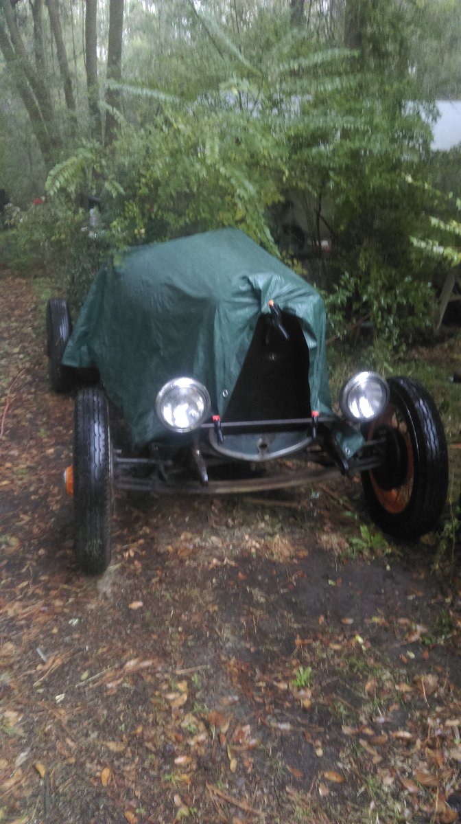 Well, I took it on the real road yesterday afternoon. Had to bounce the wrong way down the shoulder of a divided 4 lane for a hundred yards or so to get to a little two lane blacktop that's usually pretty deserted after you get a mile or so down. The first trip wasn't perfect. Over about 25, the whole ass end of the car bounced kind of violently. For those of you who know, it felt like driving too fast on a tractor with water in the tires, boing boing boing. Felt like I was in a cartoon. Boinged on back and swapped those two wore out 19" rigs on the back for the 16" rims with the new tires and headed back out this morning, chased by two of my daughters. Much better, I could go as fast as I dared (only about 35 or 40, but it sure was fun) with only what felt like a normal amount of jiggle. For a 90 year old car. It was borderline chilly out, and a heavy fog, but I felt a great sense of accomplishment. Surprised a couple of matrons pulling out of a driveway in an SUV pretty bad, though. Through my drizzly glasses and wind induced tears I got a brief glimpse of amazed expressions as I clattered by. The pitiful brakes and 22 1/2 degrees of slop in the steering wheel kept things from getting boring, especially on the rough patches (I did mention this was a little country road?), but I kept it pretty much in my lane. What joy. My girls took a video that they're going to help me edit and upload to Youtube sometime this afternoon or tonight. I'll post it here, of course. There's also some silent footage that one of my sons took of the first trip. He used some fancy camera with an external microphone that he forgot to turn on. I'll probably include it, anyway.