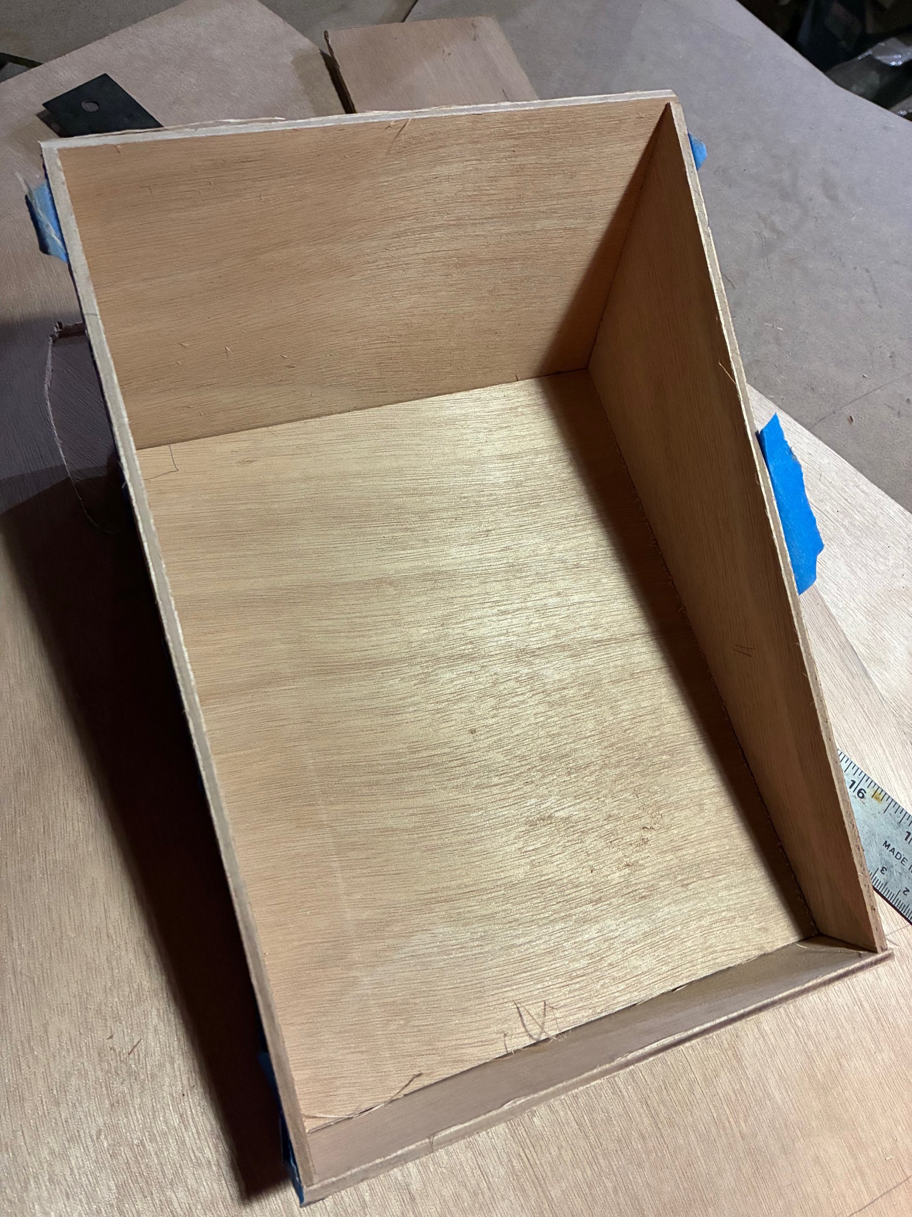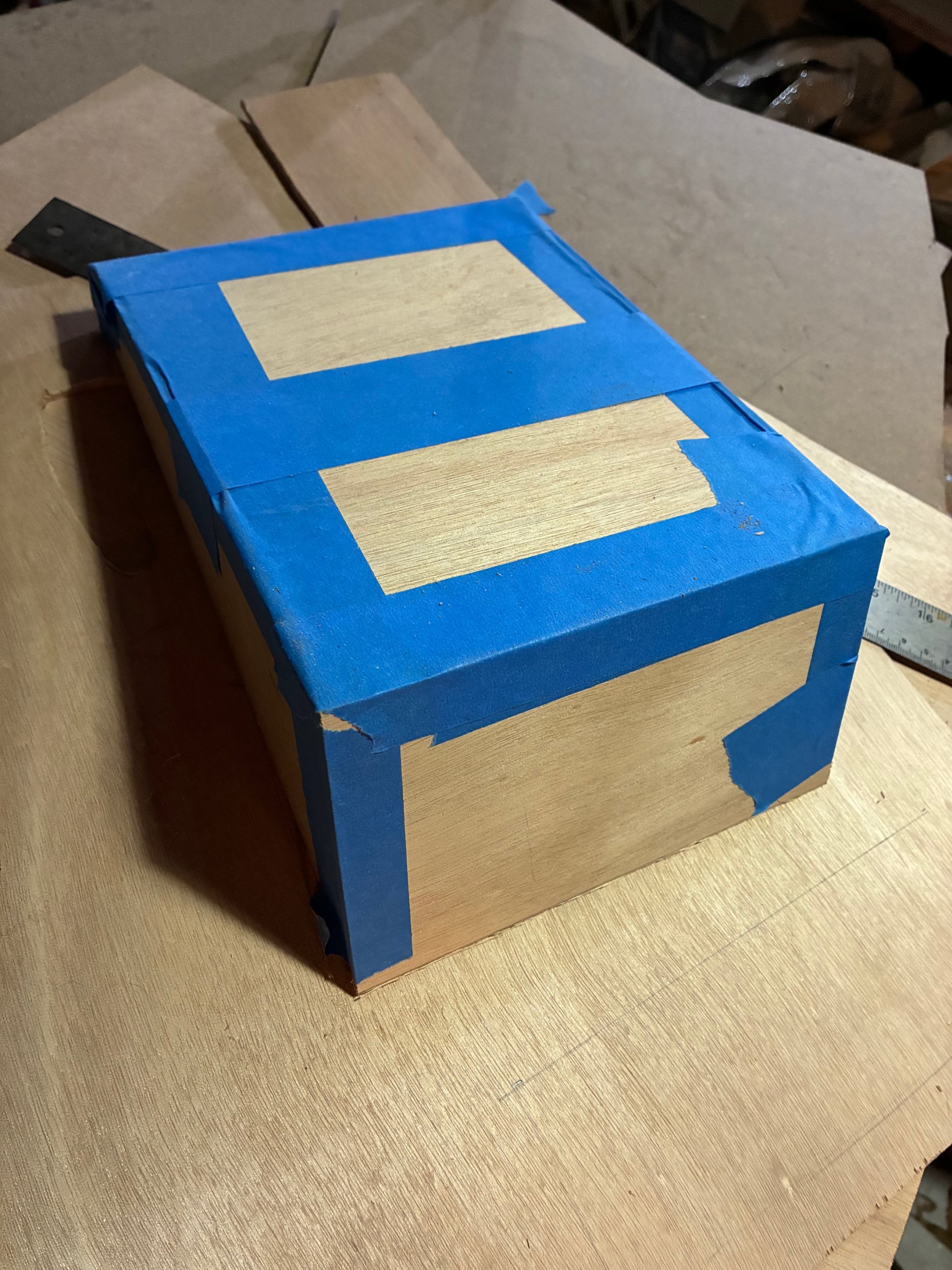 I hopped in (on?) the car and tried it out. Seems workable, but I would like my clutch heel to be a little lower, so I decided to make a box for it. I thought about folding one up out of sheet metal, but in the end I just used the same plywood. I just eyeballed the design, taped it together, and glued it with thickened epoxy. Again, not period correct, but they are just floorboards. Jeez. Haha.