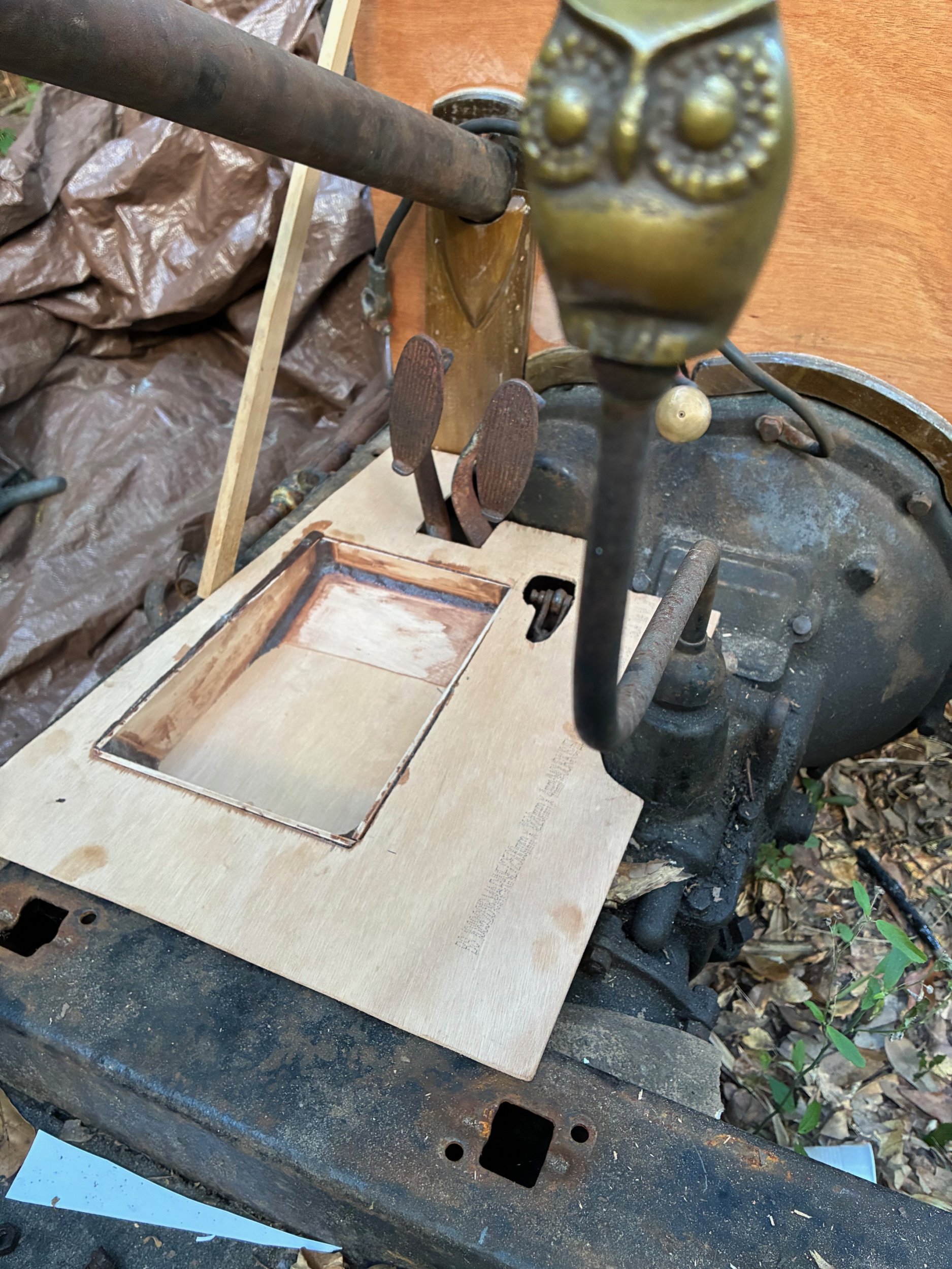 Then just cut a hole in the floorboard (I had already figured out the maximum size it could be and still clear the frame rail and the brake rod) and glued the box in. Tried the modified mess out and discovered my usually reliable eyeball had let me down. Much too deep. Easy fix, though. I just cut the bottom out, marked and cut a new bottom, and boom.