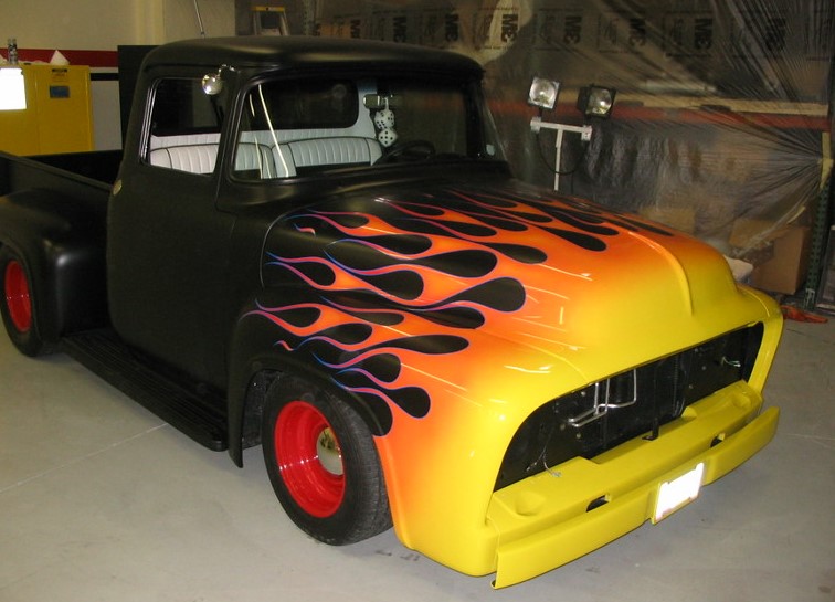 Hello, The origin of flames could have started with old straight scallops that were a droopy style. Needless to say, I have always liked scallops or flames on just about any car, done tastefully. The early straight scallops turned wavy, then turned into claw flames to all sorts of designs. A 1950 Ford Custom Convertible with early scallops turned into flames. A 1932 Ford Sedan, 671 Hemi, spokes plus wavy flames… or scallops as you see it. Flames started a long time ago and locally, in So Cal hot rod/drag racing scene, there were several styles that popped up on early builds. But, the design was all over the USA hot rod scene. So, early roadsters may have had early claw flames that were simple and in one place, coming from the motor area. I got the idea from several old drag racing photos showing one of the earliest actual “claw” flames known to the hot rodding world. A long time, Long Beach drag racers’ roadster. The combo of Fritz Voight and Leland Kolb’s roadster from So Cal, is thought to be one of the first “claw” flames on a hot rod. Could it have been a free hand drawing of the classic scallops gone “wavy” into a claw? So, let’s not forget Leland Kolb from Long Beach and the Mickey Thompson shop group. 1932 Ford Roadster Leland Kolb and Fritz Voight... Original “Crab Claw” flames Jnaki As flames became popular, it was difficult to put them on all sorts of custom cars or hot rods. They were additions, and a complete car with total flames painted on the whole, custom car just over powers the nice design. So, stylized points from the car designs were selected to highlight the nice hot rod or custom car. A 1941 Chevy Coupe with regular stylized flames on a black paint stands out from far away. How about a 1961 custom Plymouth Nomad style wagon and matching trailer for a St. Patrick’s day celebration? In So Cal, a different form of flames popped up as designers kept the original style, but added water drops incorporated into the design. So water drop flames… another version that is seen in dripping water flowing all over the place…. Even into the field of custom modified RC cars and trucks had colorful flames painted inside of the clear Lexan Plastic shell, then sprayed a full color to fill up the spaces. A 1961 Corvair truck sliding side bed doors extended cab tonneau cover water flames. A 1950 Chevy Styleline Sedan Custom with panel pinstriping and flames together. Can flames keep up with new designs and builds that keep showing up every year from the hot rod builders across the USA? As noted above, they can be put on plenty of old car designs, but with little reserve in abundance, since it can take over a custom design and make the flames, secondary. A custom Nomad style Suburban Panel Truck for the "local" paint and design shop... A wave spewing water flames on anyone enjoying the ocean in all sorts of activity... YRMV