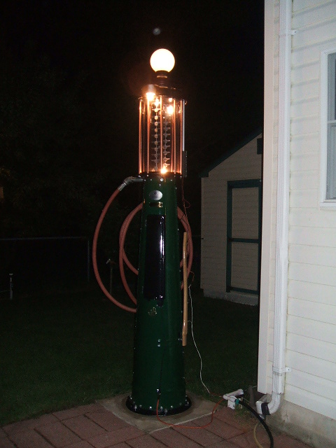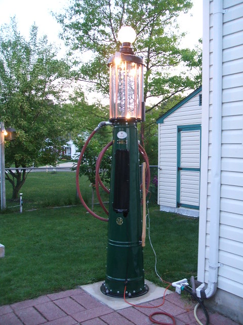 Gilbert & Barker. early 1920's. Purchased out of a barn near York, Pa. It had been used on a farm to pump kerosene- and so the "innards" were in great condition. We sand blasted, welded, primed, and painted. The kids were more work; but the little one helped every step while the big one was away at college. The pump is a bit over 9 feet tall- so I didn't even get to ask about putting it in the house. Now it resides with the old cars in the shed.