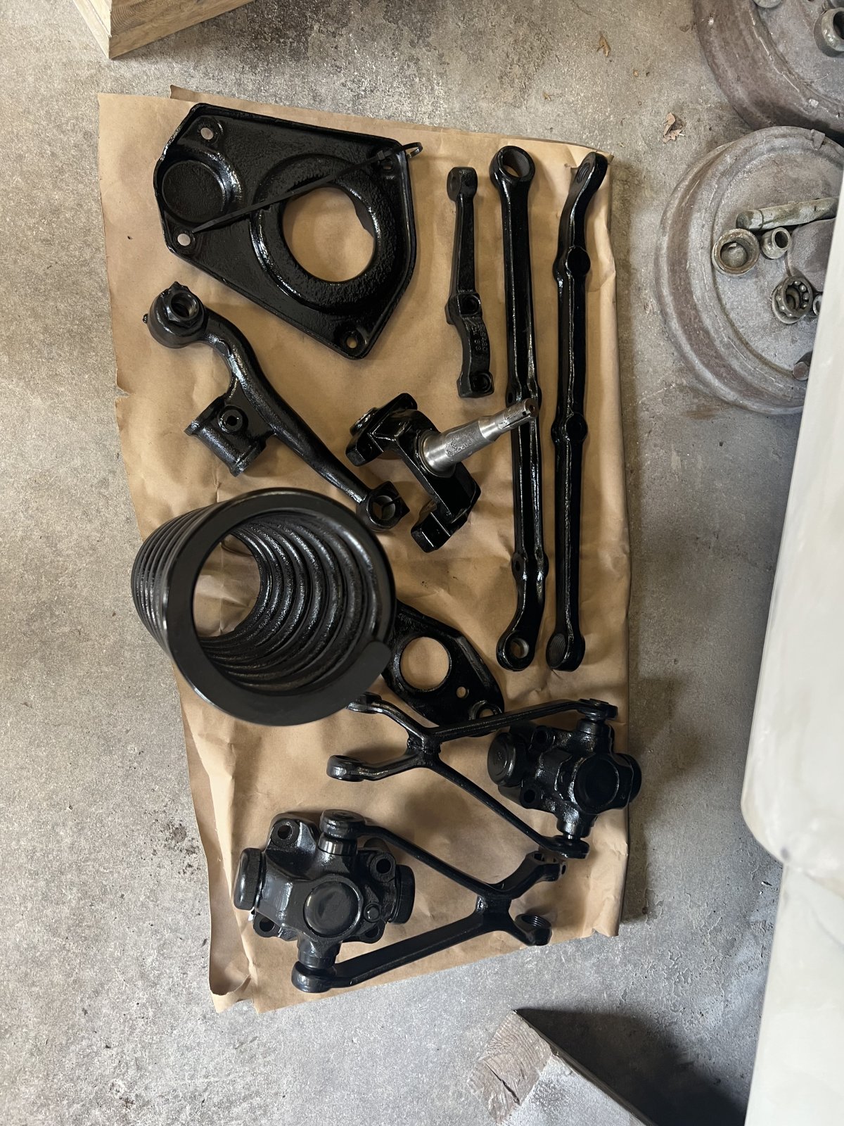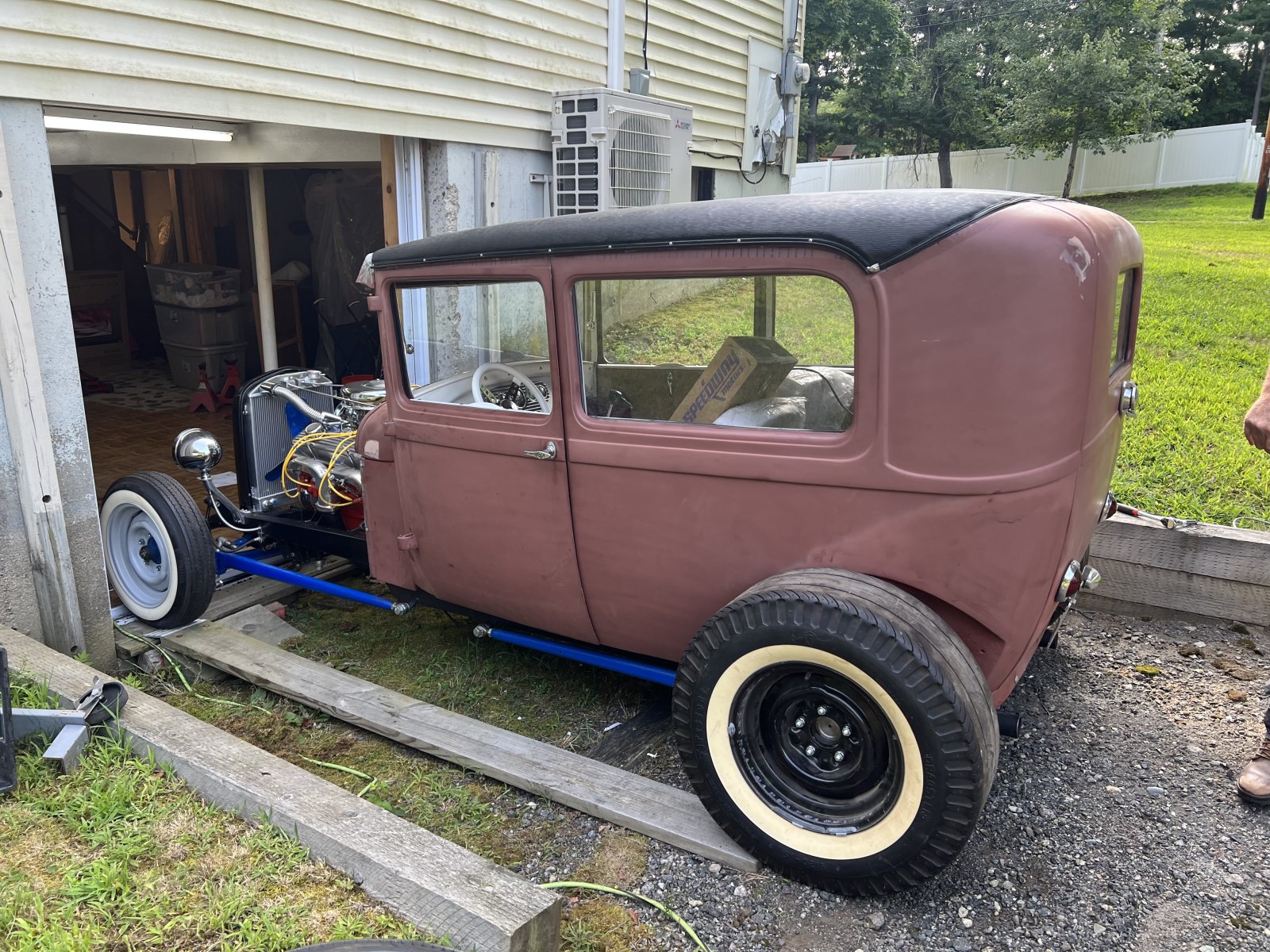 Whoops, didnt realize it had been since August! I've been keeping busy, i freshened up a '69 Chevelle SS 396 for a friend of mine, who inherited it when her dad passed away in 2023, but he had owned the car since he was a teenager in the 70s. It had been off the road for 20+ yrs with a wiped out cam. Engine rebuilt, (not by me), new gas tank, carb, distributor i stole off one of my other cars, fuel lines, trans lines, fuel pump, radiator, inner fenders, cleaned up wiring, new shocks, some new brakes, sway bar bushings and links and probably a bunch more, but got it starting driving and stopping for them. Plugging away on the Buick and Edsel and freshening up my C10 since it sat most of the year and started running a little rich. Carb look ok, but there was a bunch of junk in the inlet port so im guessing some stuff got pushed through and gummed things up. i had a new one on the shelf i tossed that on and will rebuild the other one when i get the chance. Also got the tires, firestone bias ply 7.00-15 in for the Buick. i almost didnt buy the trim rings for the Wheelsmith smooth wheels, but surprise to myself, i like them better with the ring. Working on getting the pedal to work a little smoother with the dual carbs on the straight 8. Cut up a Summit aluminum underfloor pedal and adapted it to work with a 3/16 rod and used a heim joint at the pedal instead of the cable. It was kind of herky jerky, but i removed the return springs off of the Strombergs and that made it a little more fluid, but i still need a return spring, so i might cobble something together at the pedal end of things. Also found some banjo fuel fittings from Nystrom Performance that solve my issue of the fuel lines occupying the same space as the hood sides, and still use 5/16 hardline. I'll figure out a way to attach a more stock looking pedal in place of the cut up aluminum chunk there now Im thinking i might try to space the end of the pedal bracket over a little bit to both move the rod away from the header and also maybe try using a clevis shackle to see if that makes things smoother. i have a bin of that stuff that i'll dig through a try a few things out this weekend Im starting to hunt down all of the brake stuff im missing on the buick, theres a shop, (Then and Now Automotive for those in the South Shore Ma area) next town over that supposedly has the drums in their warehouse, but im missing some of the specific bars for the rears that i'll have to search for. Getting the stock Edsel pedal to work with the later 460 big block is going easier than i was expecting. i had to weld shut and redrill one of the pedal bracket holes to fit the intake mounts, and then just bent and threaded a short piece of 3/16 and found some quick release ball joints. I have a set of pulleys for the crank, waterpump and alternator coming in tomorrow after dicking around with old pulleys i had scavenged around. CVF Racing had a set of scratch & dent ones on their ebay page for a little over $100 for the 3 piece single groove pulley set, so i grabbed those. Next will be pulling the exhaust back out to fully weld up and make a few hangers, then start figuring out what changes with the wiring need to happen with the 1 wire alternator and pertronix distributor. Ive read a few posts on here about it, but need to go and map it out with the car infront of me I havent hooked up the original kickdown rod yet to see if that will fit the C6, but hopefully thats not too far off that something cant be micky moused together I went to the end of the year New England Dragway swap meet in October? and found some good front fenders, and some odds and ends for my pile of parts that is starting to resemble a model A. there was some figuring out what that car started as, it didnt look like a cut down coupester, but the body lines were different than a roadster, and the cowl wasnt a roadster. Some detective work leads me to think it was originally a Leatherback Coupe, which explains the cowl/ windshield stanchions, the rear trunk panel to bodyline, etc. Im fine with it, its going to be a simple little full fendered hot rod. i have $150 into this pile of stuff with the body, 59A and trans, front and rear '40 axles and suspension, a handful of steering columns, clutch and brake pedal, front fenders, roadster windshield stanchions, crate of headlights, extra cowl tank, even the little running board luggage rack and a bunch more stuff. Its going to be pretty low buck and i am trying to hold off "starting" on it until some other stuff is further along, but its nice to be able to go to a swap meet and find parts for a change. The Buick and Edsel are always slim pickins! The other '29 tudor sedan seems to have a problem with the rear end so that will get pulled and theres a handful of other things that need a good once over. and a little off topic, but what occupied half of this year