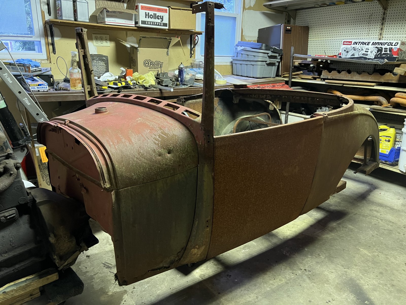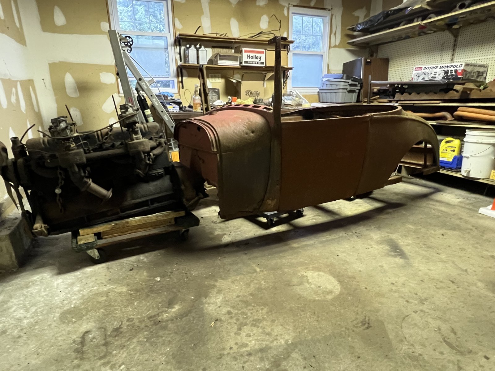 A few semi interesting goings ons lately Sent out the front Delco Lovejoy shocks to be rebuilt and got them back within a couple of weeks from Apply Hydraulics so i was able to put the front end back together on the Buick and get it on it's wheels for the first time in atleast a year. I still need new inner tie rod ends and to freshen up the front sway bar, but good to see it on the ground again Got the Edsel back up on stands to finish the exhaust, its a little tight trying to fit a 3" pipe around the leaf springs and gas tank back there, but it will eventually fit with some futzing around. Its just about done from the manifolds back, tucked up pretty tight to the floor since the wagon sits so low and for being so big, theres not a ton of space to play with underneath with how low the rear floor footwells go down Put my little C10 that i built years ago to work moving the big block for the Chevelle im doing for a friend of mine, to the machine shop. It's in good hands, he's a long time engine builder and also has several nostalgia nitro cars and a 12k horsepower funny car they finished building last year and have started campaigning this year Raised bed floor and a very low truck makes the 396 look huge! Now for the interesting stuff! A buddy's cousin unfortunately passed earlier this year, both are long time hot rodders, and as such, he's been tasked with cleaning out the horde, as well as being gifted the last car the cousin was building, a 28/29 tudor sedan. It was in the basement, and had yard drove at some point, still has some finishing up details, but a very cool car. Im not a Ford/ Model A expert so i dont know what the suspension and steering is from, but got it back to the garage and tucked it in the corner. Im really digging the all white interior And to do my part in helping clean up the property, i took home a 28/29 roadster body. There is all the parts to do a complete'ish car, but the frame that was there is a little janky, plus i have plans, but there is a complete rear axle and transverse leafs, several front ends, a 59a-b flathead and trans, some banjo wheels/ columns, a bunch of solid front axles, and a shed full of cowl gas tanks and what looks like a 1937 ford truck all disassembled. got the body home last night and into the backroom of the home garage and started imagining! I always thought a big straight 6 would be cool in a roadster, so by that rational, a free dual carb straight 8 is even cooler? theres a handful of projects i need to finish before i can start doing anything with this, but its never too early to start collecting parts! Possibly a T5 to adapt to the baby buick 248 straight 8, and i've always thought quarter elipticals were cool, and i need some front suspension to handle the weight. Im going to try and keep this pretty low buck, and so far a free body, free engine, and atleast free rear suspension is off to a good start