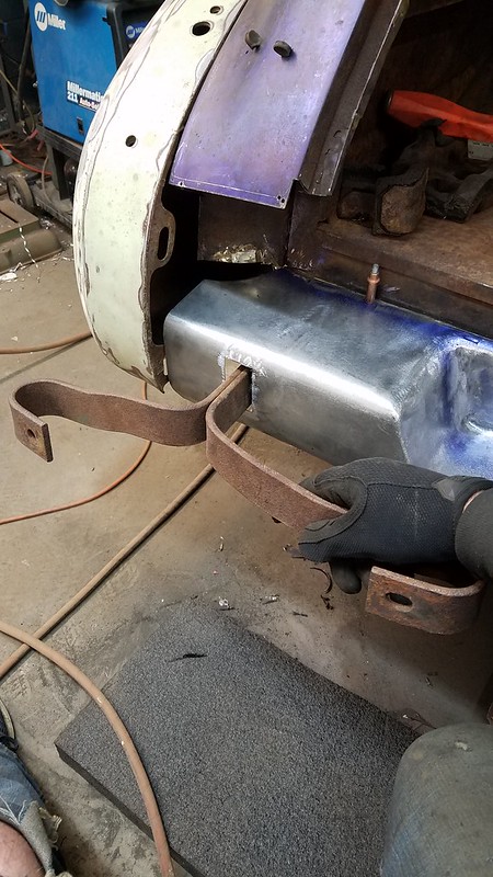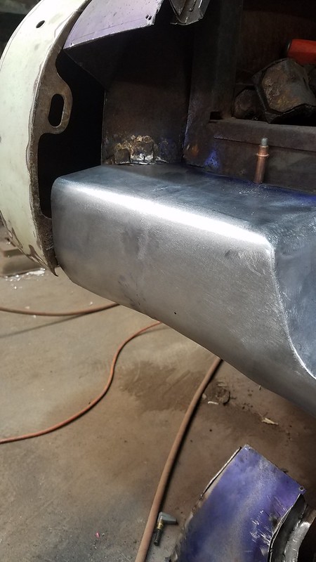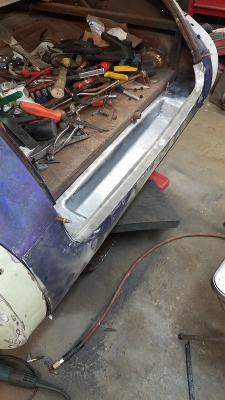A bit of a lazy weekend since I have the week off and figured I would be at my shop enough, but got a few steps closer to everything fitting right and started planning out how i'll do the trunk floor/ recess. While im in the trunk, I think im also going to make a battery tray/ box somewhere back here rather than under the passenger seat and recessed in the floor just to make it more accessible, I just want to track down an old 6v battery to use to figure out a position for it. Probably just on the trunk floor somewhere, maybe flush with the trunk tray that stores the spare tire so it doesn't look too out of place. Some more trimming on the opening of the tail panel, a little shape added to match the trunk lid and got the lower channel tacked in place. Lines up pretty good, with some room left for adjustment afterwards. The blue dykem spray and the overhang of the channel makes it look dented in but it will look fine when its trimmed back and sanded.
