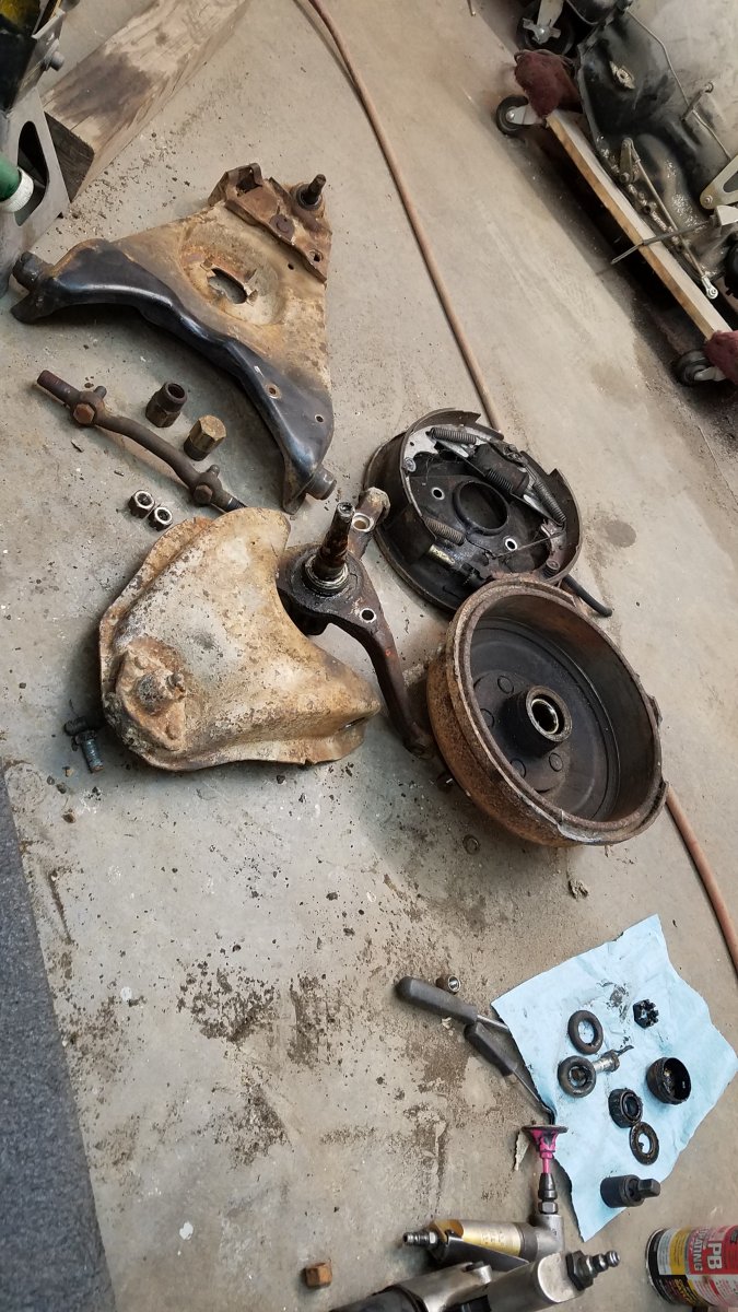 Now most of the puzzle pieces are made, I still have to make the side 'profile' corners pieces that the fender mounts to and add the weldnuts to them so theres something to actually bolt to, (i'll also be replacing some of the other threaded inserts with new weldnuts as a few of them are rotted away). Also need to add a bit of shape to the big lower lip section where it meets the side channels, not a lot but just to make it line up nice. i'll pull the trunk lid off this week, brace it all up and start cutting out the old this week and hope it will all fit together if you see on the left side, my measurements where I started to make the curves were off by an inch There are some old trunk repairs that ive been humming and hawing over, part of me wants to just go replace everything, but they are mostly clean and well done for the period I suspect they were done in, so I think it would be cool to keep them as a little history of the car.......but mostly im lazy and cutting out the trunk will be another can of worms Even had some time to play with the Edsel over the long weekend and start tearing apart the steering and suspension, not many pictures of that since it was pretty grimy and didn't want to keep reaching in my pocket to grab my phone. It wasn't as bad as I was expecting for being off the road since '68, some stuff was stuck pretty good but I remembered to bring home a small 3" cutting wheel to zip some of the bolts off. I need to go through and compare what came with the rebuild kit and what will still need to be bought. Not sure if we will be reusing the springs or getting a new pair, but leaning towards new from Eaton for the price. The 460 big block that's going in and the old E400 that was in there before were roughly the same weight so we don't have to do much figuring out with that, and the shocks reference as being the same for some flavor of tri-five chevy so we should be spoiled for choice of what to use there. Some of his intention is to use the station wagon as a family hauler and as a dog hauler for his dog walking business in the city, so we might do some brake updating and maybe a Scarebird kit while we have it apart for a little piece of mind