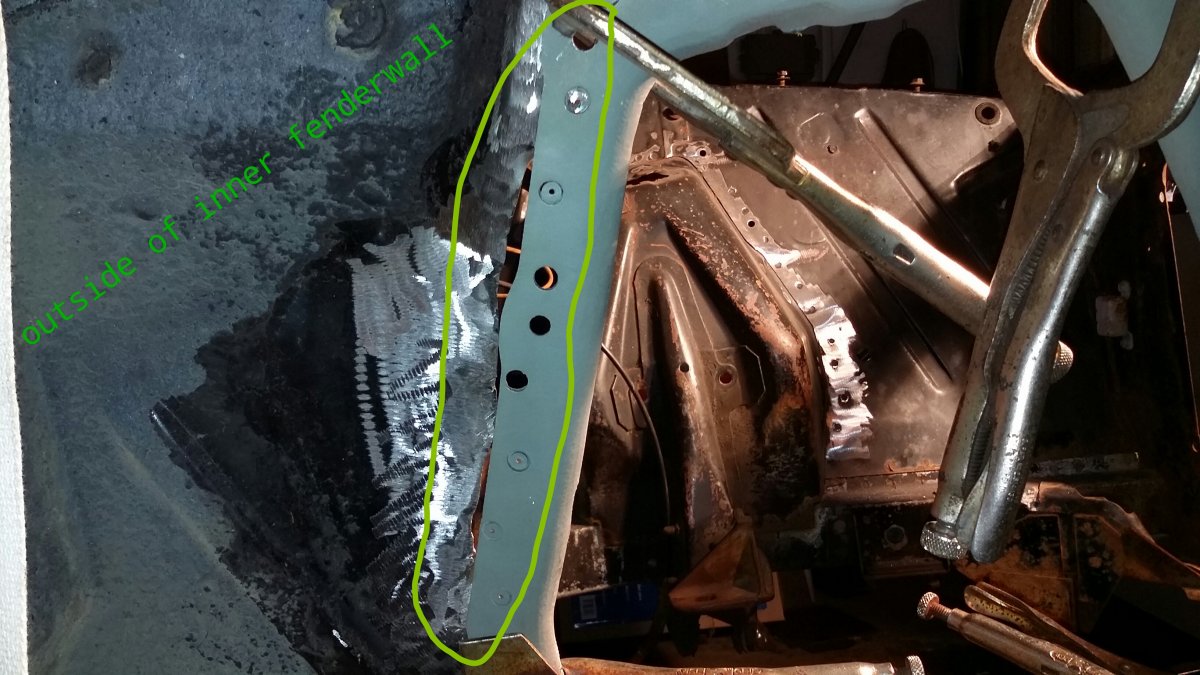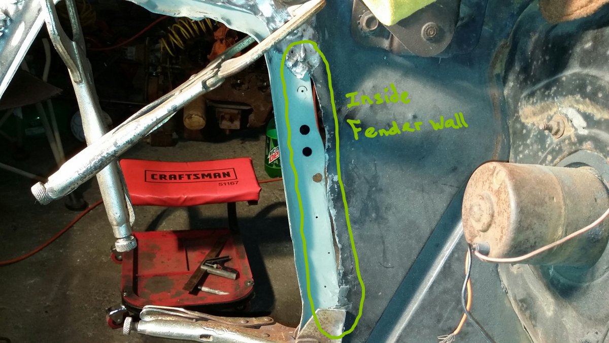 Ok, now back to the program...... Can somebody please help me out on how I should repair the sheet metal that I ripped and cut out not thinking about how flimsy the fender wall is without the shock tower flange, so im going to try and work it back in but not sure what to do with the missing shit that I cut out so the hole in one area is now larger then the flange so it cant be welded back in. The largest area is near the 3 holes which is about 2in. Thanks with any help. photostudio_1484869166712.jpg photostudio_1484869429677.jpg