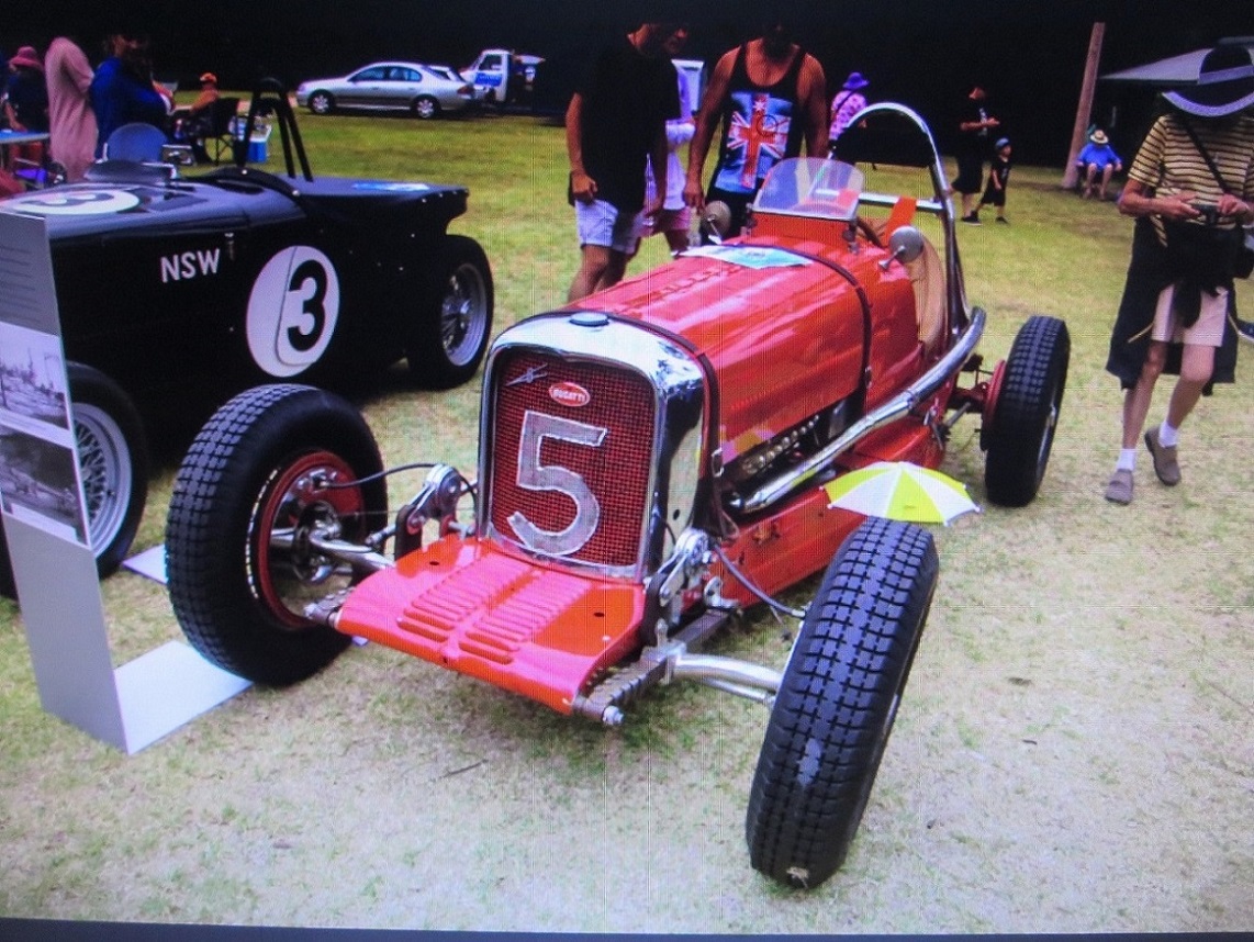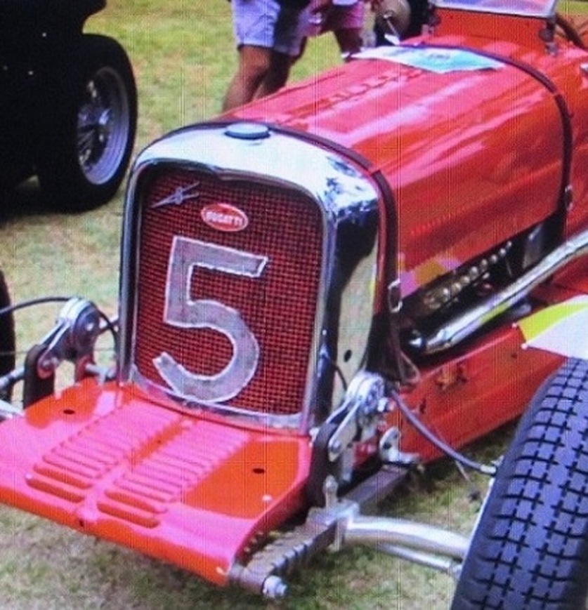 7. Closer look and it has a cut-down and chromed 1932 Ford grille shell :cool:. The 8 chrome acorn nuts and Ford V8 badge are more obvious. If the original owner/builder sold the original Bugatti grille/radiator that would have easily covered the costs of the Ford V8 conversion and tires and body work and hotel costs on a race weekend and fuel and keep on going with any other costs you can think of o_O:rolleyes:.