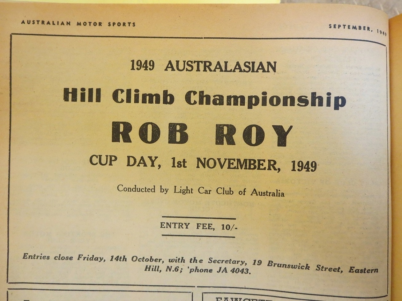 A couple of adverts for hill climb events, both of them not too far north-east from Melbourne. The 'CUP DAY' in the Rob Roy advert refers to the Melbourne Cup horse race, the 'biggest' horse race in Oz, always held on the first Tuesday in November. It's a holiday in Melbourne. (Australian Motor Sports magazine courtesy of State Library of Victoria) 020.JPG 043.JPG