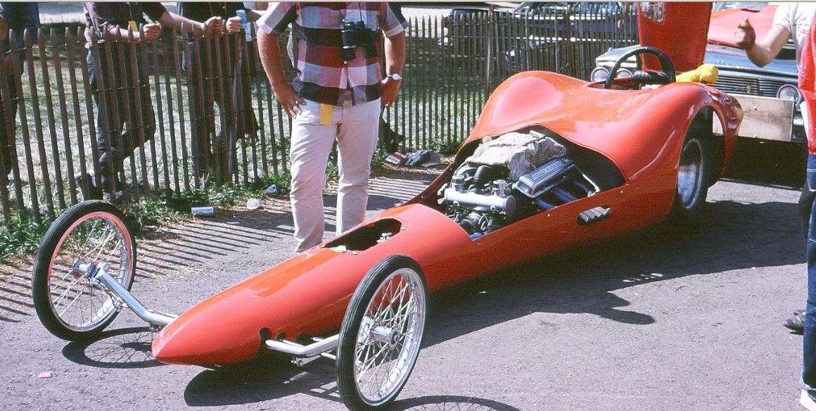Mooneyhan, Ferguson, Jackson and Faust, aka the "Jungle 4. This body was originally designed by Robert "Jocko" Johnson and built for Frank Cannon but he abandoned it at Bakersfield after one slow pass. Jocko convinced the Jungle 4 team to try the body on their similar Woody chassis but it proved to be too prone to the affects of cross winds and after a couple of runs that saw the car hit the finish line lights at Lions and go completely off the track at the Pond it was abandoned again. Roo