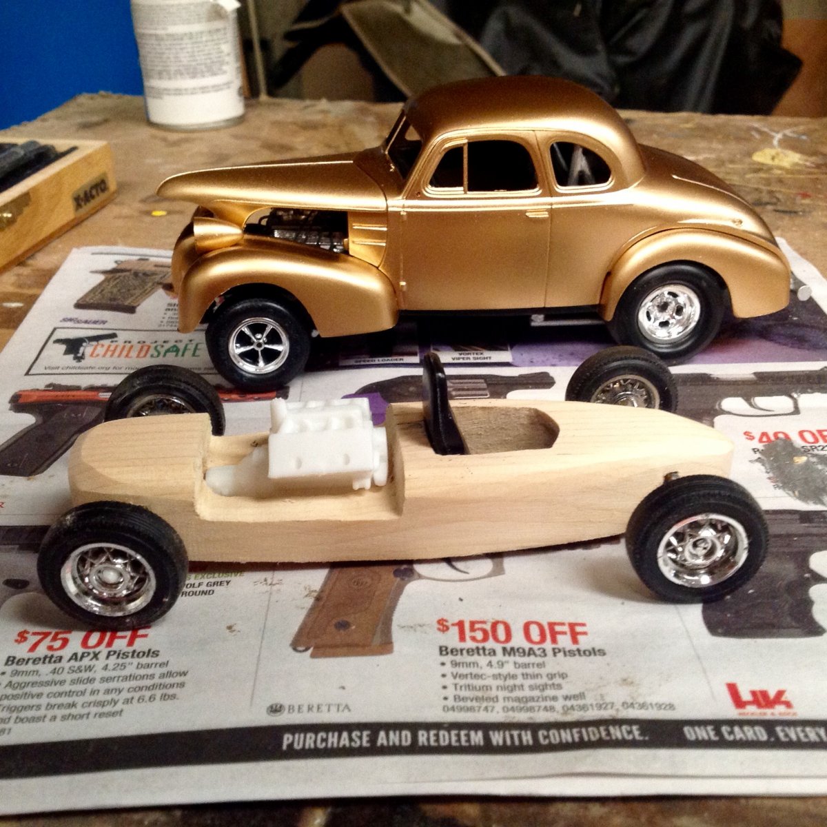 How about a pair of ‘36 3 windows? Chopped top custom and vintage drag car. Roof/cowl/firewall on these fit like garbage. Adding to the front edge of the cowl on the chopped car and split the firewall on the stock height drag car. The main body and fender unit on the stock top was first built around 1975 or so. Stripped it, created a trunk lid and used a few parts from the latest release. Worst part so far was building the tiny English wheel to make a new trunk skin! The custom will be as smooth on the bottom as it is on the top. Stay tuned. SPark
