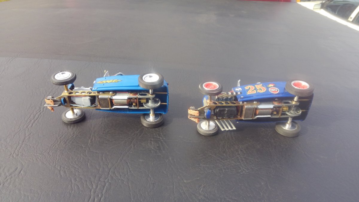 These little, thin, long motors looked similar to each other. It depended on what model of cars you bought from a kit or pre-made. The most common motor was the Pittman motor. They came in quite a few stock, "factory pre made kits." Hello, Nice little roadsters. They are keepers for sure ! Our friends had a couple of these after Christmas one year and immediately got taken to the road race circuit at the local hobby shop track. They kept flipping because of the high center of gravity and parts started to break. They had the stock brass frame with aluminum wheels. These Pittman Motors were usually built in to 1/24 scale models pre made from the factories. (whoever made them) The motors were hard to modify. So they were left stock. Later, after the motors were used, they got put in custom/homemade, thin wall, brass frames we made. The bodies were the lightweight, clear plastic, British Formula One Cars like the Graham Hill and Jim Clark versions. They were painted the green and white designs. Jnaki We added lighter weight chassis using ball bearings to make the wheels go faster. With the chassis lower to the ground, the streamlined Formula One clear/painted bodies, these little motors were now, fast. (with rear pinion/ring mods... and they did not flip over unless the driver was too anxious…) These small Pittman-style motors were not for drag racing, except for stock bodied, factory, non-modified, slot car classes.