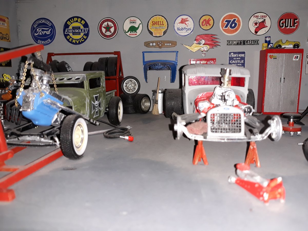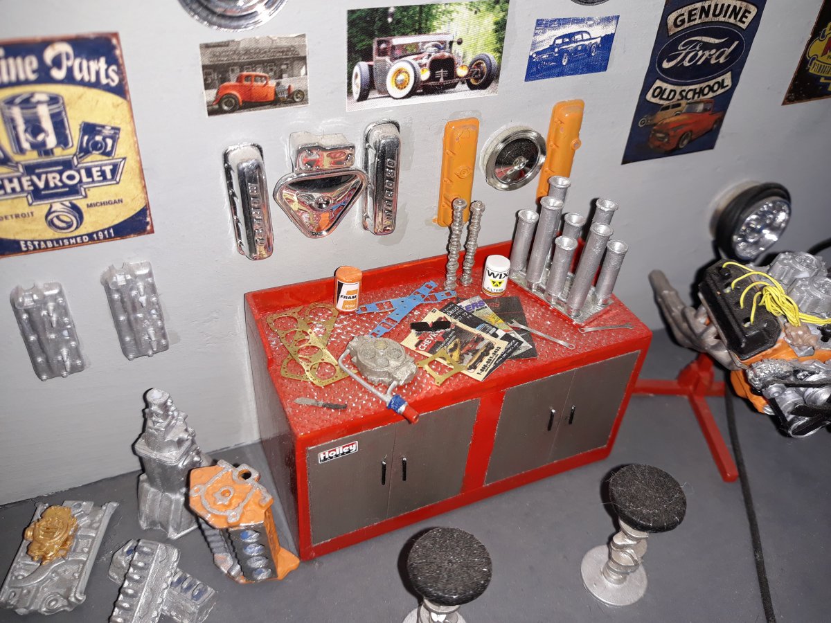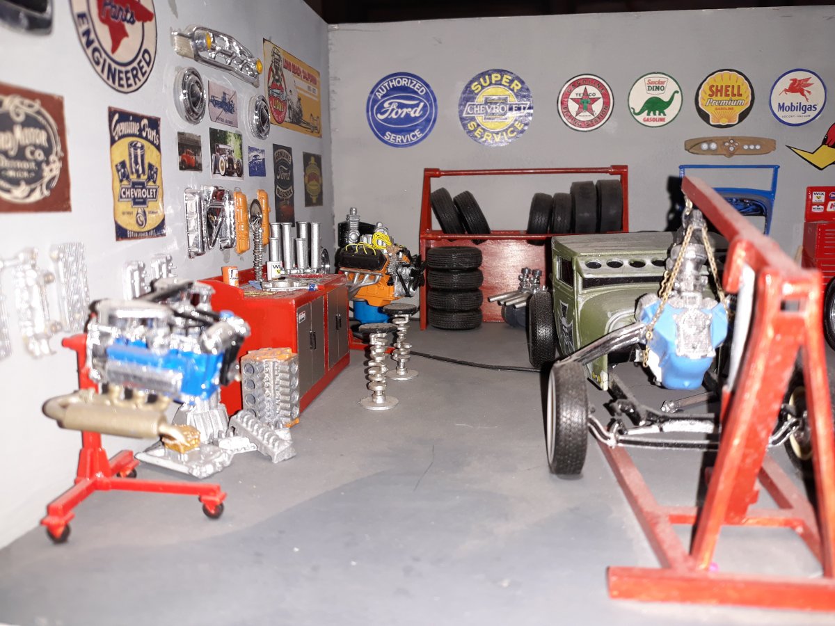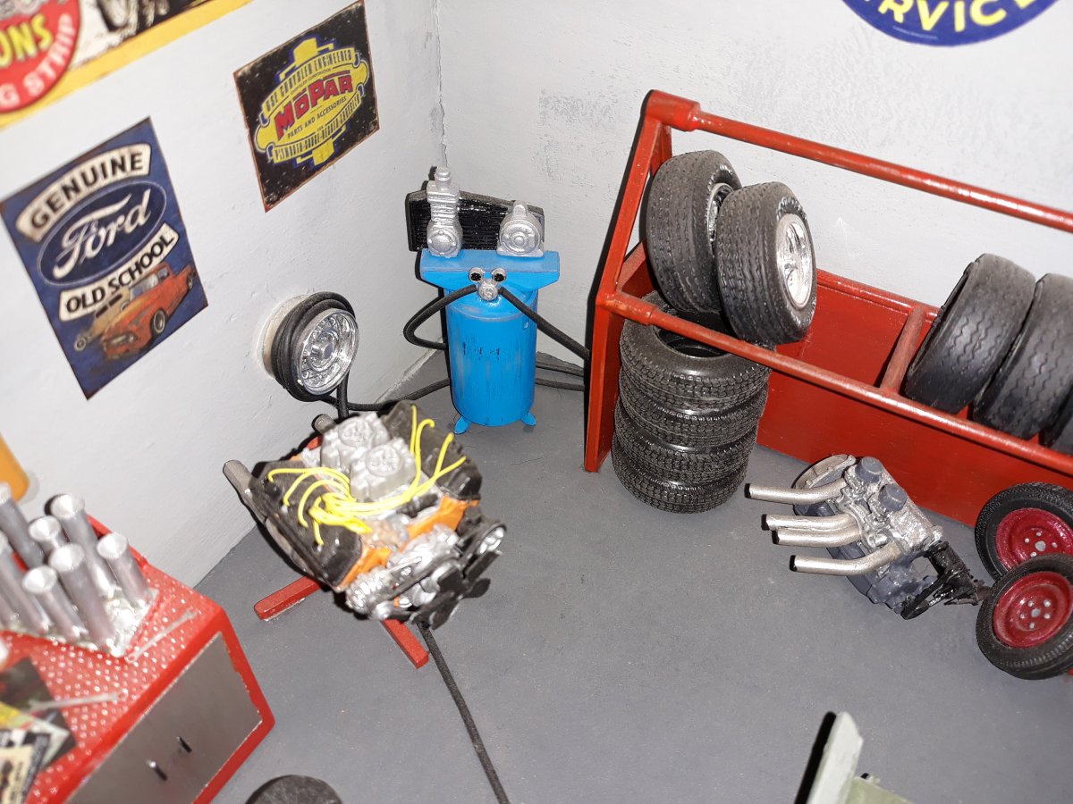 Thanks! Iwas laid up for a bit, and couldn't go to the garage. So I made one. The tool boxes, cherry picker, shop vac, drill press, brooms, guns, jack stands, and a lot of other stuff were hand made. My wife laughs about the trash by the trash can. The signs were cut out of magazines. The truck is a kit chopped up and the coupe is a resin body and scratch built frame. The engines and extra parts came from the parts box.