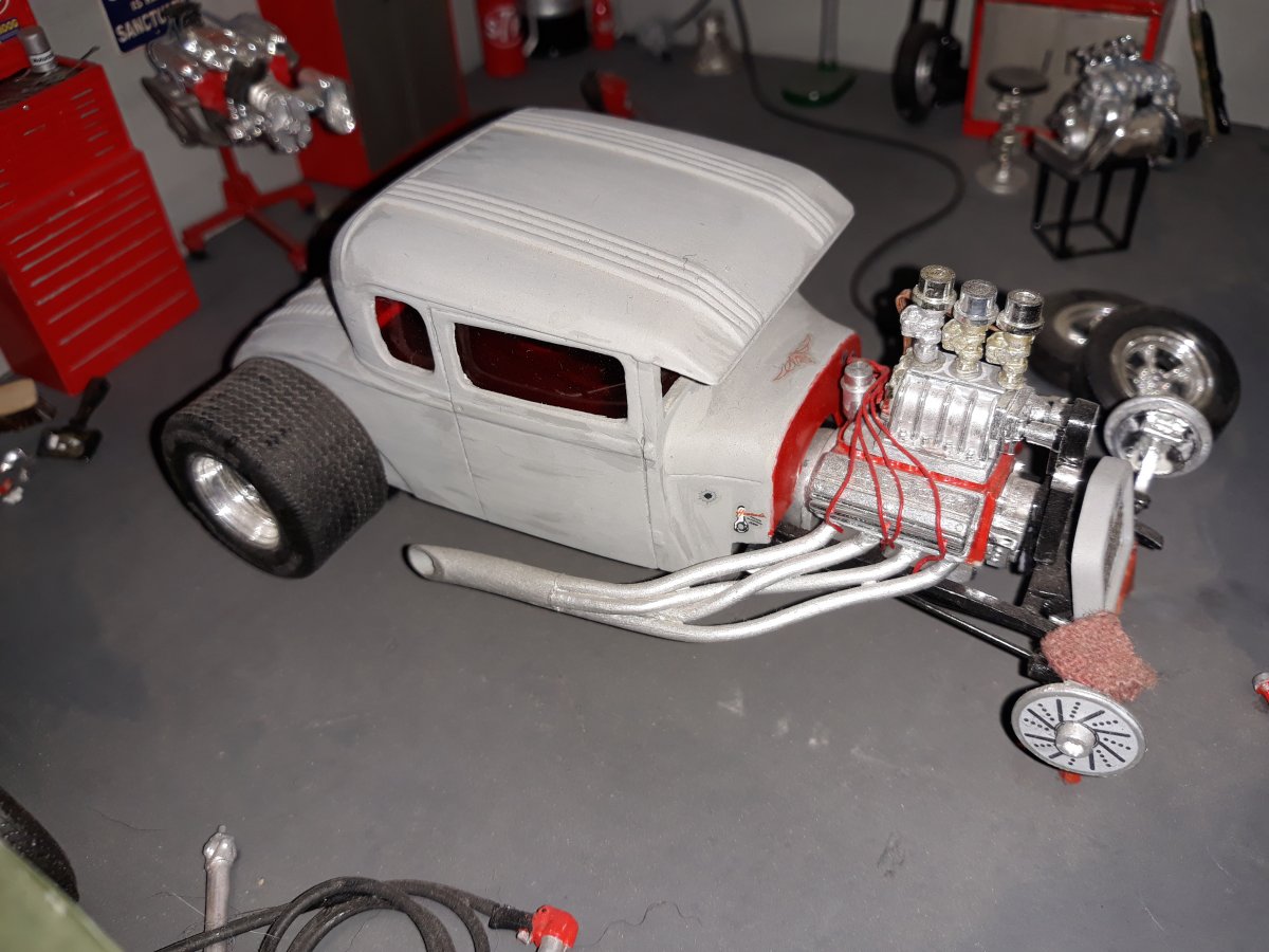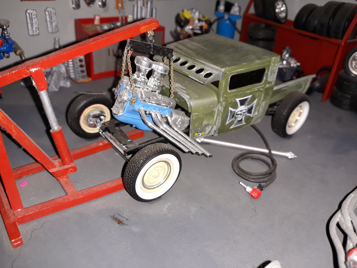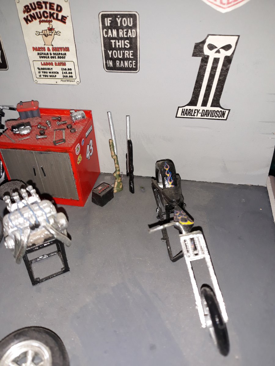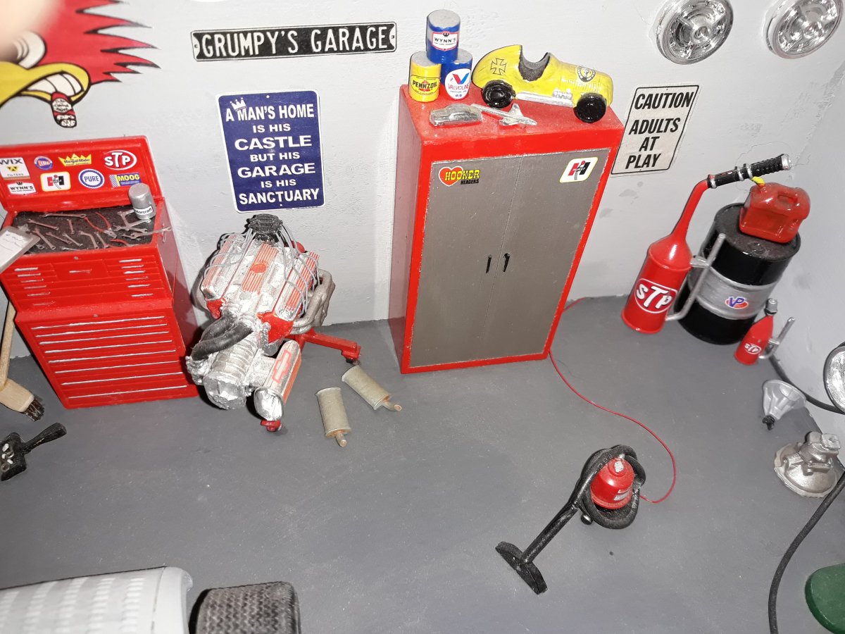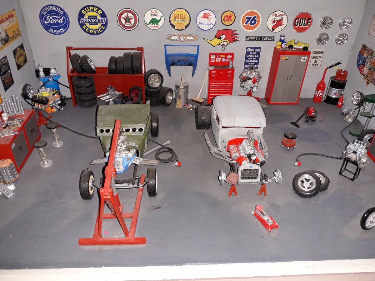 Thanks! Iwas laid up for a bit, and couldn't go to the garage. So I made one. The tool boxes, cherry picker, shop vac, drill press, brooms, guns, jack stands, and a lot of other stuff were hand made. My wife laughs about the trash by the trash can. The signs were cut out of magazines. The truck is a kit chopped up and the coupe is a resin body and scratch built frame. The engines and extra parts came from the parts box.