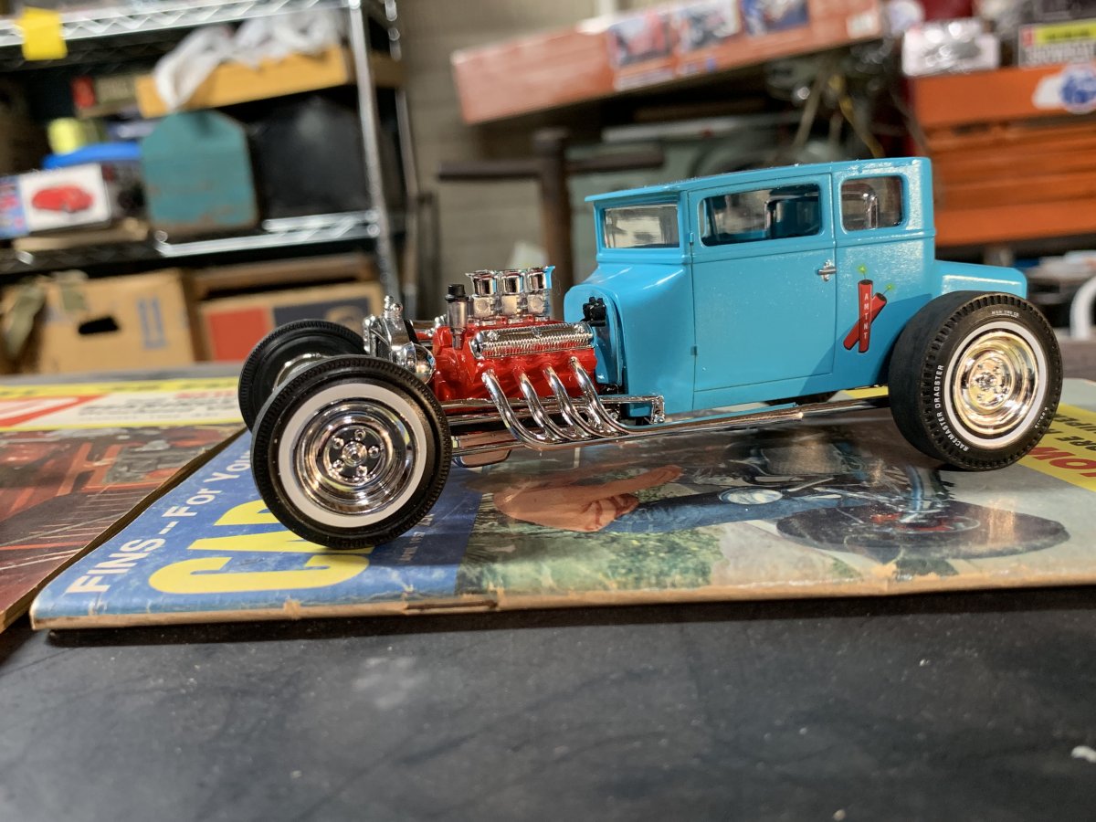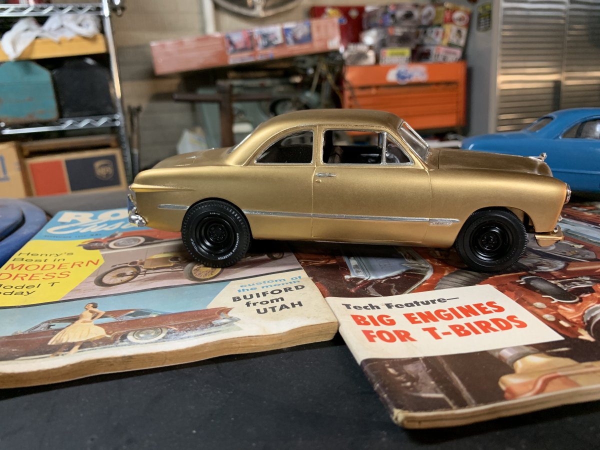 well,it's been a while since I posted any finished builds as I am limiting my time away from the computer to concentrate on getting a lot of kits finished since I recently retired back in October of '18.So,here are the one's that have been done since then and have 3 more on the bench currently that have the bodies painted and need to be started on. Only showing this Foose Cadillac to show the new paint the Testors line has come out with called Color Shifting.This was painted their color shifting Green Copper over Model Master Gray primer.They have a Black gloss base coat you are supposed to use but it does say on the can you can try other alternatives which I spoon tested using the gray primer,white primer from Model Master along with the suggested black however it does not go good with Tamiya silvers so I would stay away from that. This is the recently released MPC '57 Chevy gasser painted Testors 1 Coat Star Spangled Blue.Didn't like the wide slicks so I used a pair from the AMT Parts Pack slicks and Gasser wheels,decals from Slixx. AMT '32 Ford Coupe using Modelhaus Artillery wheels and tires.The color is from Krylon Short Cuts but the name escapes me,if you need to know I do have the can back in the paint room and I can look it up.I need to cut some strips of balsa wood for the roof. AMT '40 Ford SD painted 1 Coat Mystic Emerald and Model Master Black,wheels covers are parts box items that I have no idea what kit they are from,tires are Modelhaus big & little wide whites. AMT '33 Ford kit painted Tamiya Blue/Gray,wheels from Modelhaus,slicks from AMT parts pack AMT'40 Ford Coupe painted a Tamiya AS color again that escapes me,caps are from a Corvette with Modelhaus tires And finally one I just completed today,Lindbergh's '34 Ford pickup.Color is Tamiya AS-8 Navy Blue,wheels and tires are from Revell's '37 Ford Panel.I have the hood top just need to get more paint to finish it. Thanks for looking and any comments you wish to leave good or bad. Happy Modeling !!